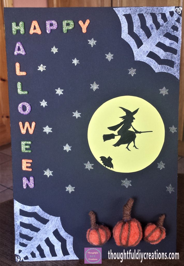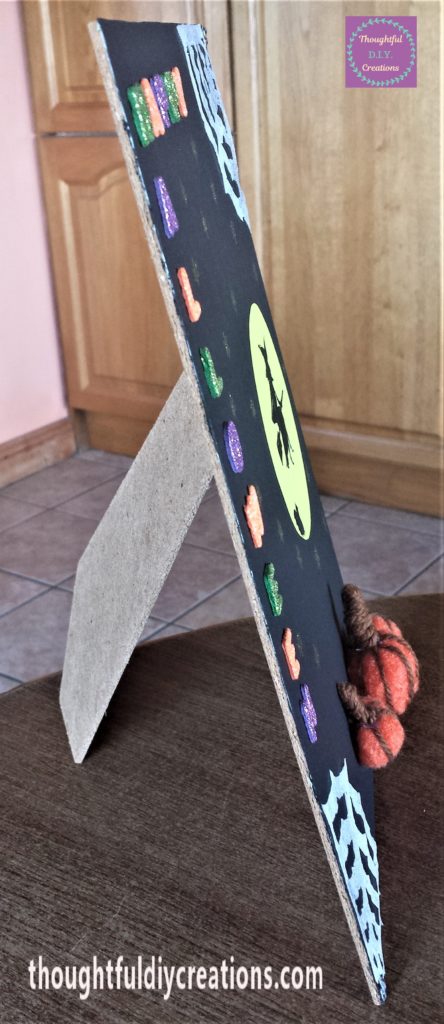 I was really happy with the outcome of the Halloween sign. I love that I got to use some materials that I had collected for so long. It’s great to make use of what we have already. I love the sparkle from the stars and the glitter alphabet stickers. I like the 3-D effect from the pumpkins.