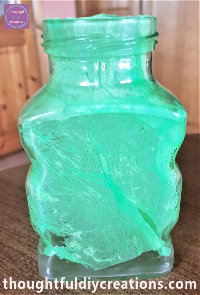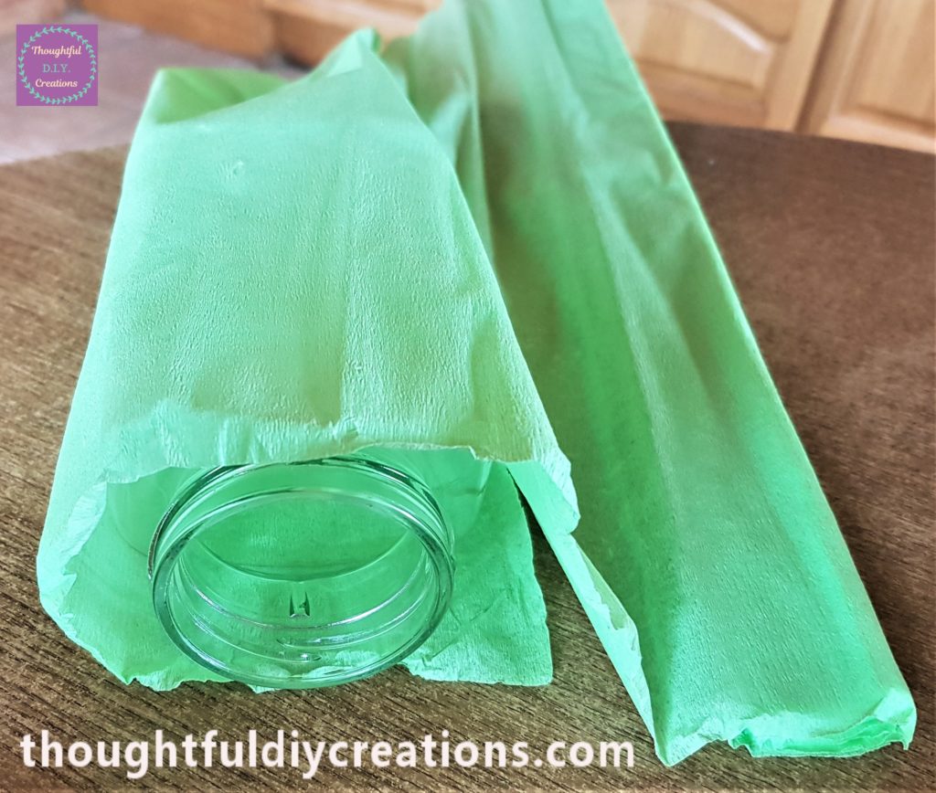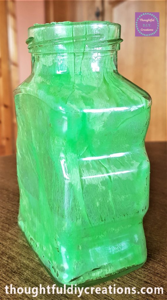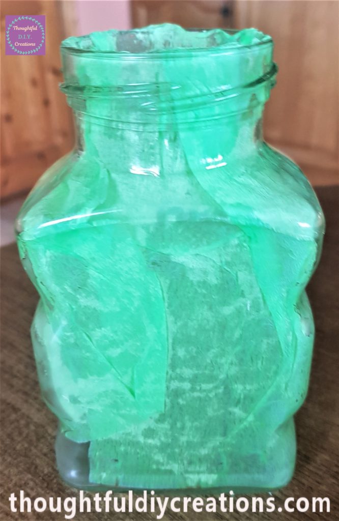 I then cut more green crepe paper and filled in the gaps on the jar. I put the cut piece of crepe paper into the bottom of the jar and then held it to the gap on the jar with the handle of the paintbrush. I added a little more glue over the crepe paper to keep it in place. I did this until each side of the jar was covered with crepe paper.