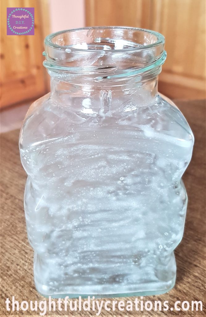 I got a small paintbrush, removed the lid from the glue and dipped the paintbrush into the glue and spread it evenly on the inside of the jar until the sides of the jar were covered with glue. PVA Glue.