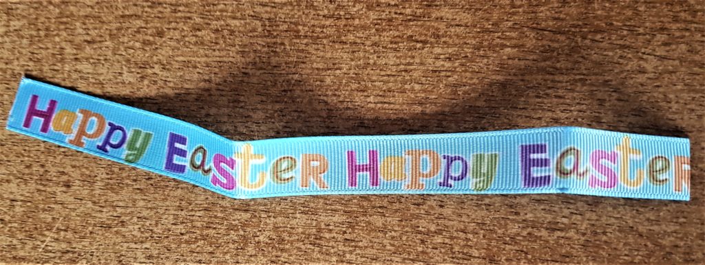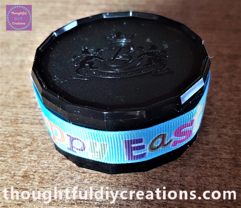 I chose the last blue ‘Happy Easter’ ribbon. I measured it around the side of the lid and cut it. Decorative Easter Ribbons.