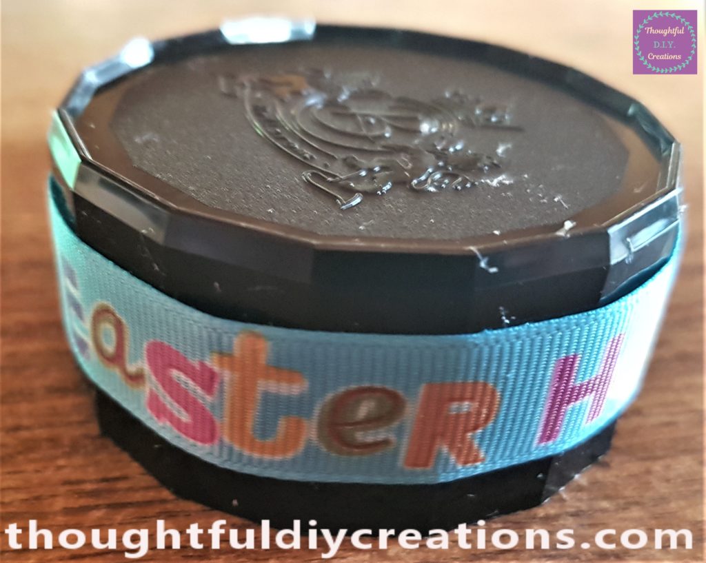 I allowed the glue to dry fully overnight. I am leaving the 2 flower lids as they are because I think they blend in with the Easter theme. I decided to decorate the black lid. I had a Pack of Easter Ribbons that I thought would complement the lid. Decorative Easter Ribbons.