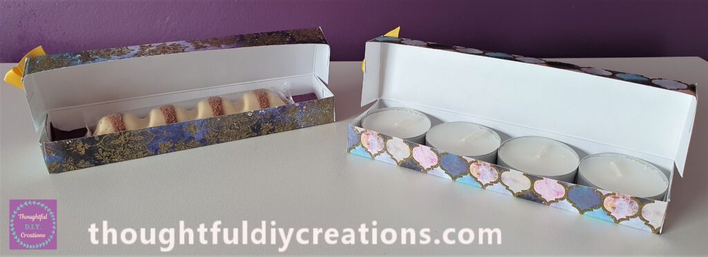 I put 4 Citronella Tealight Candles into this Gift Box. This would make a Great Gift to Bring if you were invited to an Outdoor Event or Barbecue to ward off Flies and Bugs.