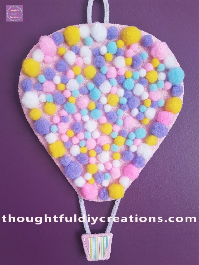 I was thrilled with how the Hot Air Balloon came together. I think it’s cute and colourful. It’s amazing what can be made out of Cardboard and old clothes. This craft is a nice way to use pom poms and have them on display. It is such a versatile D.I.Y. activity as it can be decorated in numerous different ways.