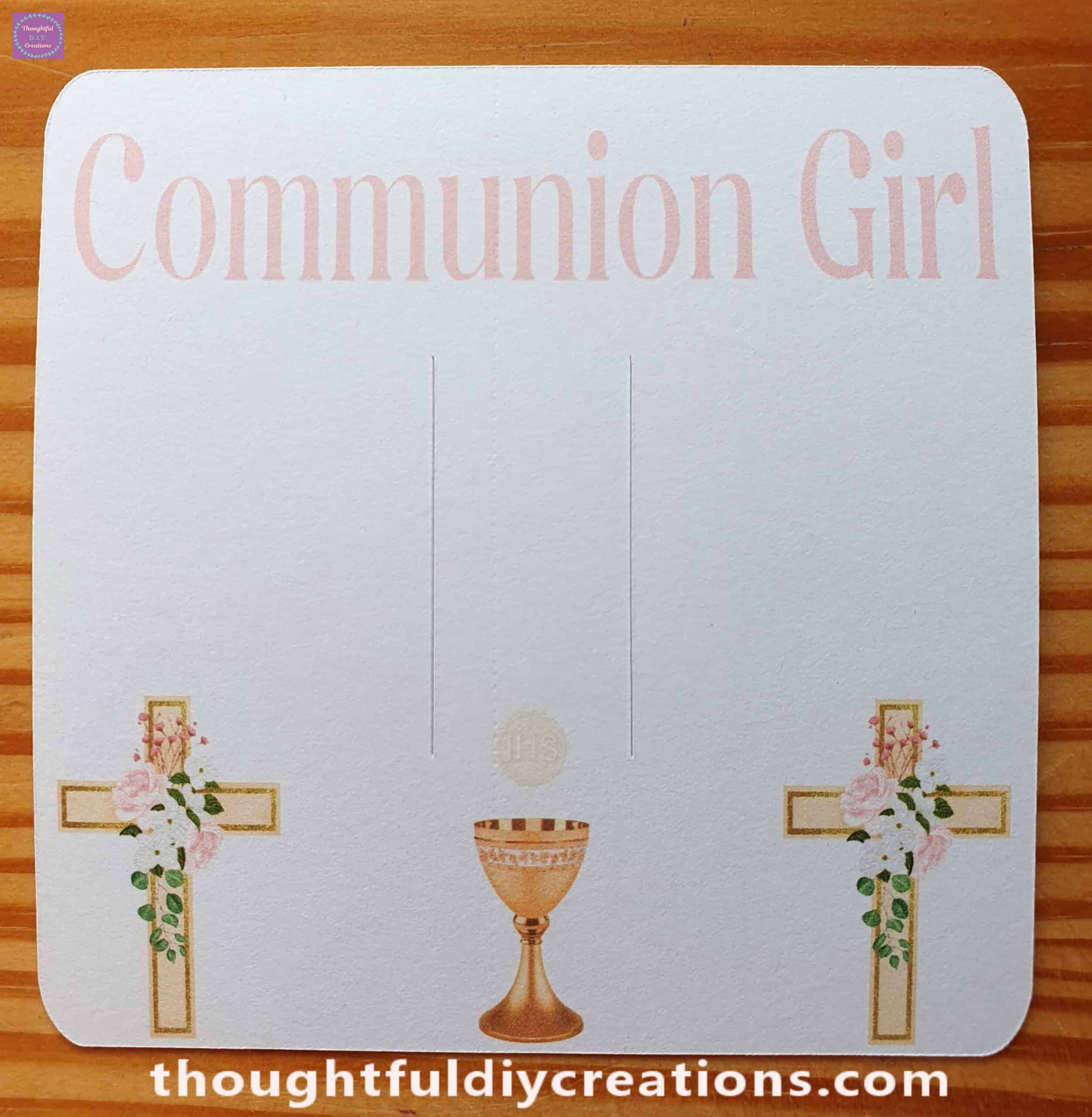 This Clip Holder features ‘Communion Girl’ in a Soft Pink Coloured Font at the Top, a Stunning Cross with Pink and White Flowers and Green Leaves on the bottom two Corners, and a beautiful Gold Chalice on the bottom mid-section of the Gift Holder.