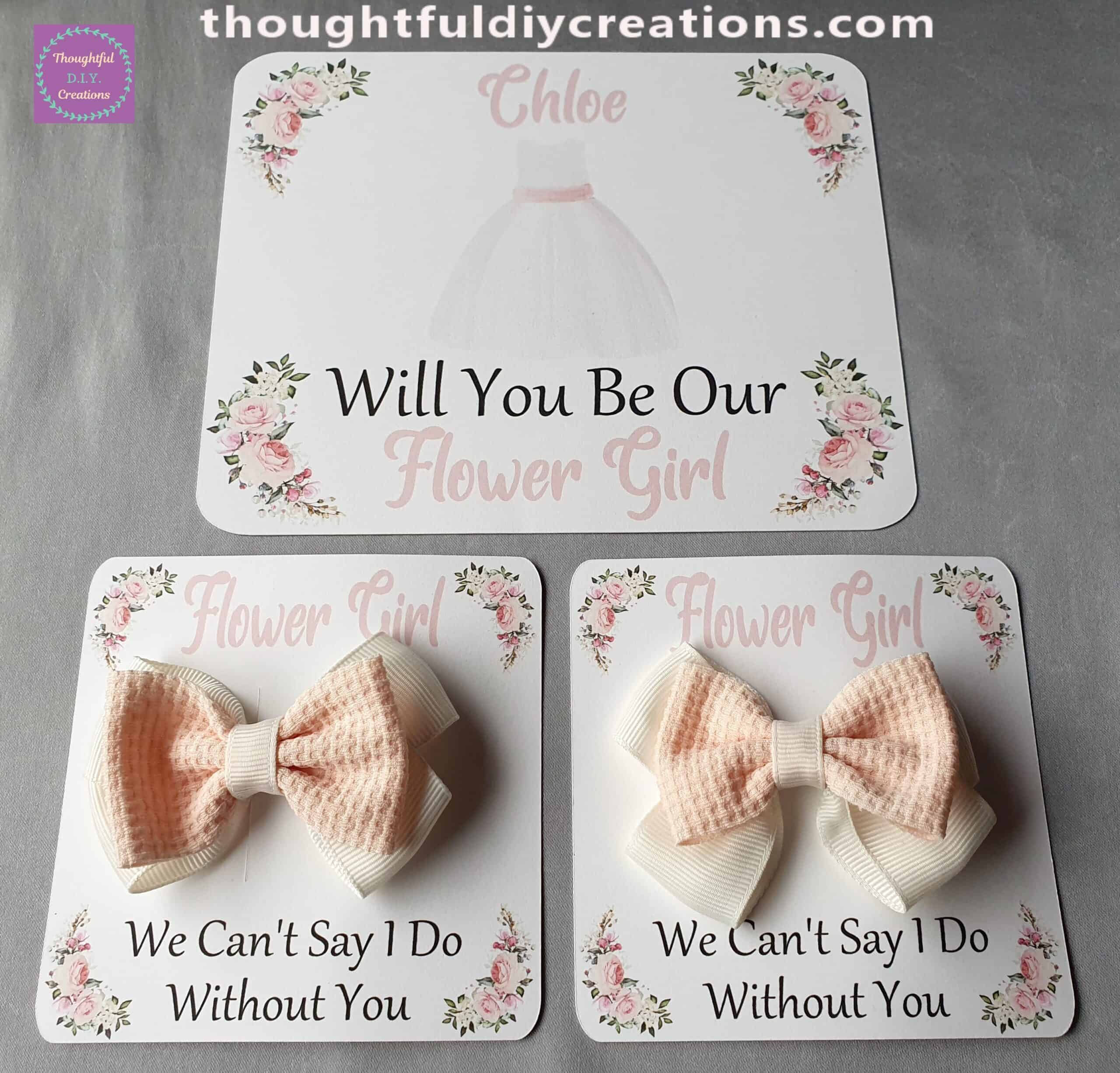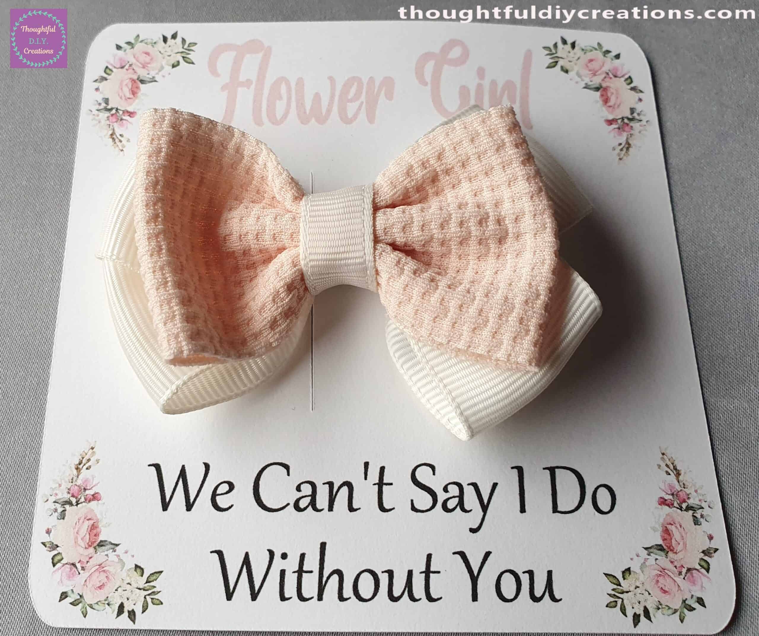 Cream Double Layer Flower Girl Bundle; Personalised Flower Girl Proposal Card and Two double layered Cream Bow Clips; each on a Flower Girl Clip Holder.
