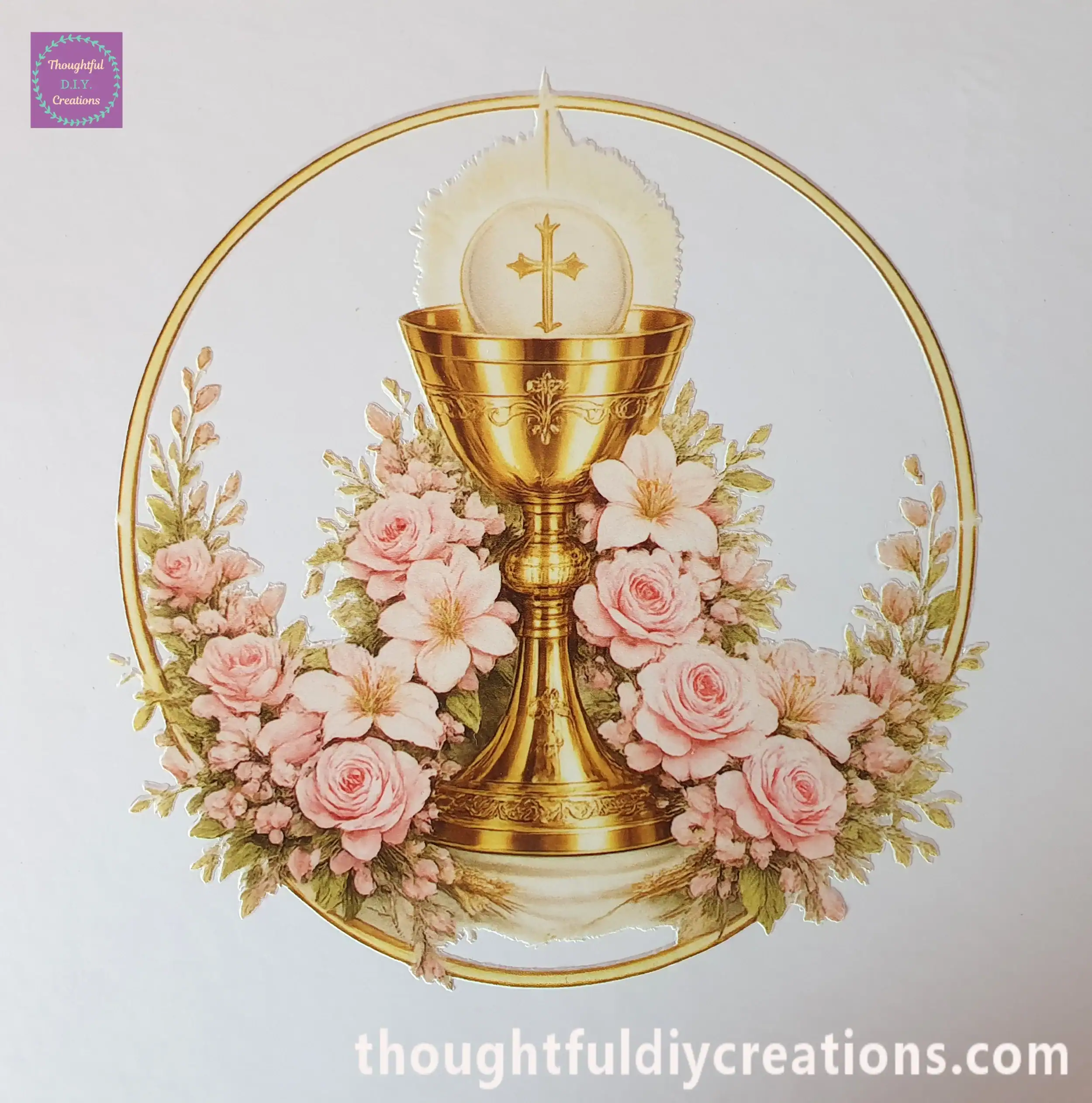 The Image features a stunning Gold Chalice with a Cross on the Communion Bread above the Chalice, gorgeous Baby Pink Flowers, and a Yellow Circle with Gold Outline to complete the Image. The Image Measures 12cm in Height and 11cm in Width.