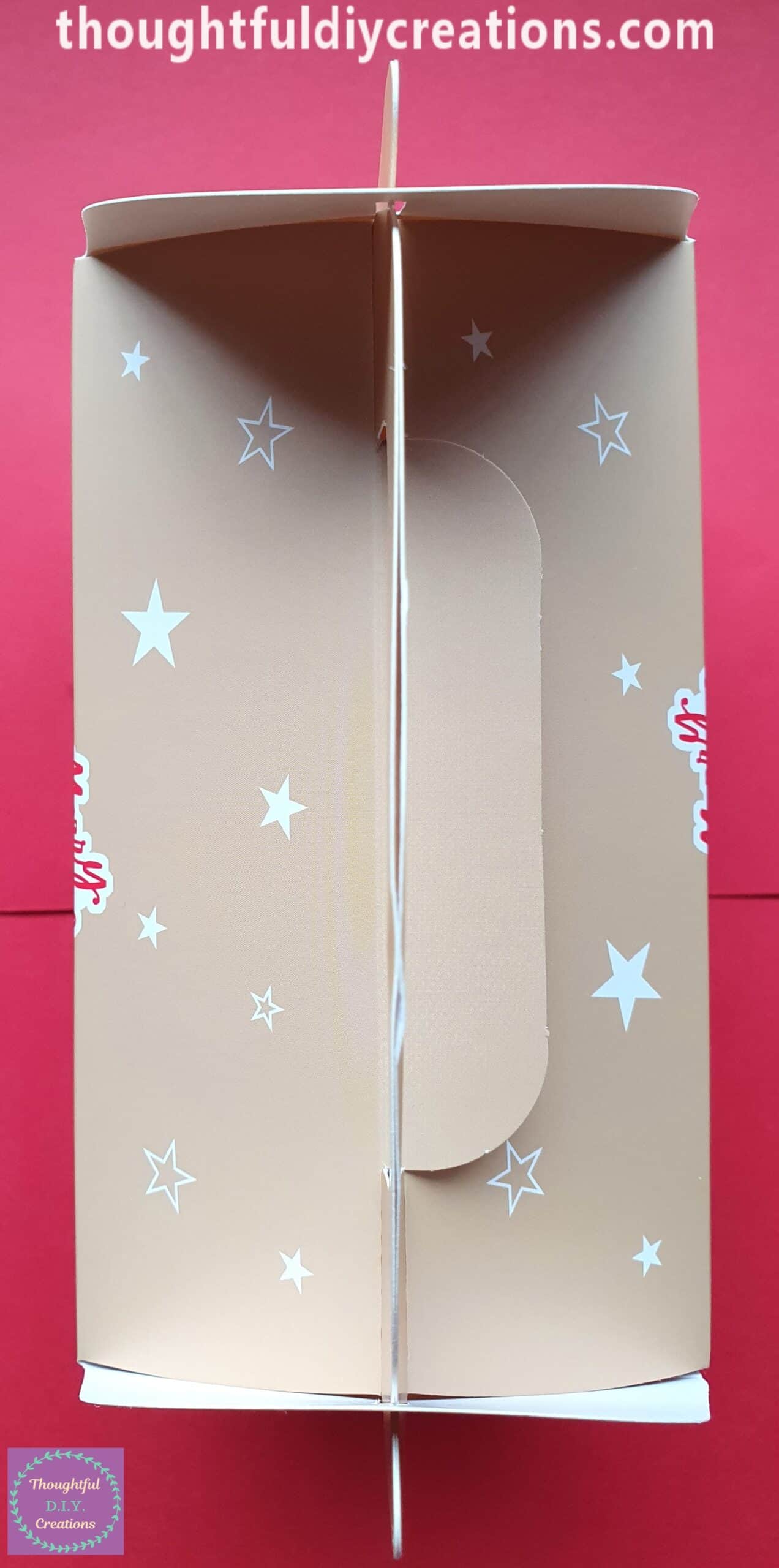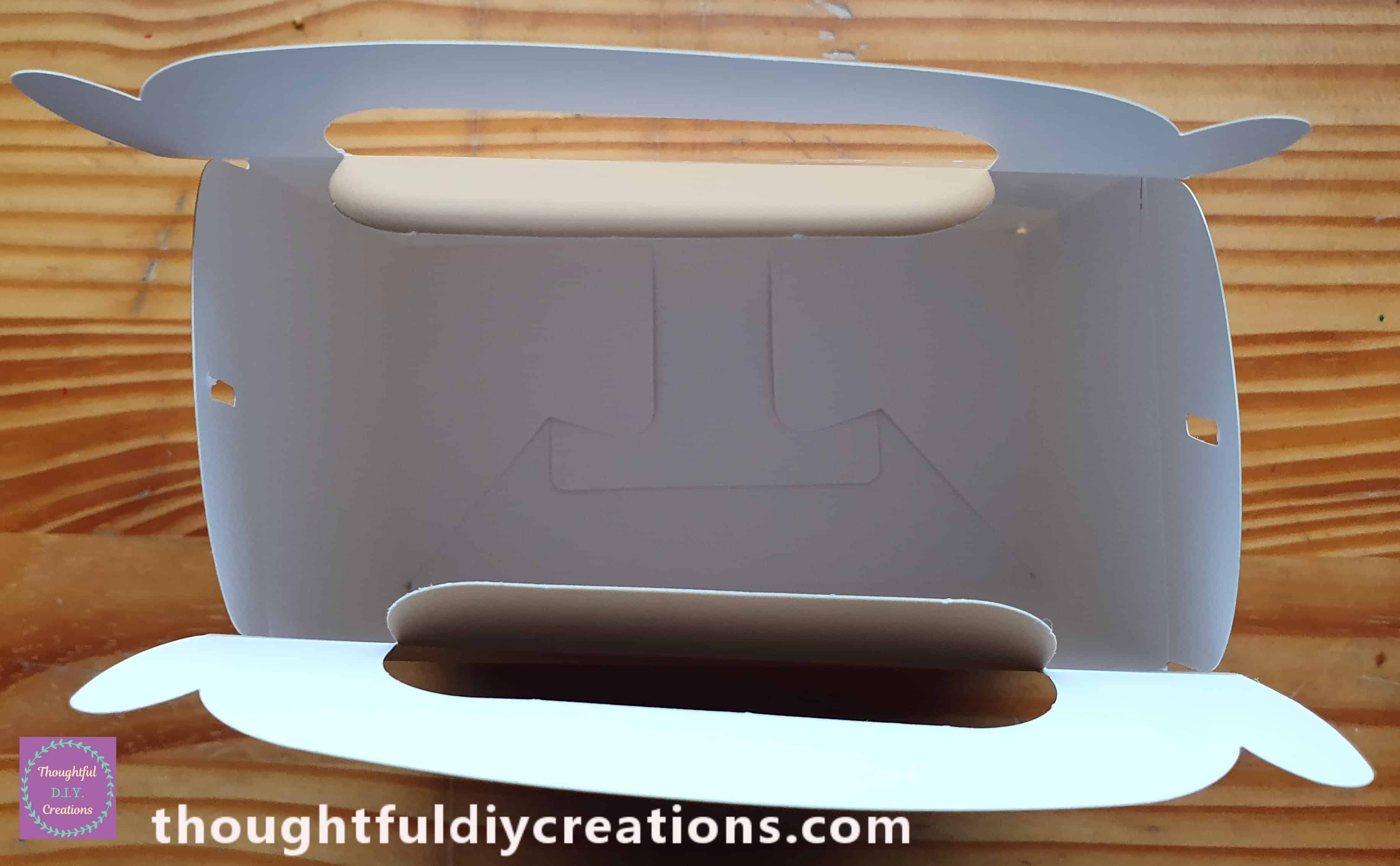 It is easily put together by Folding over each of the Score Lines, and Placing the 2 Tabs together on each Side of the Handle, then put through the Slots on each Side, on the Top of the Box. This will Close the Treat Box; covering the Treats Inside and keeping them Secure.