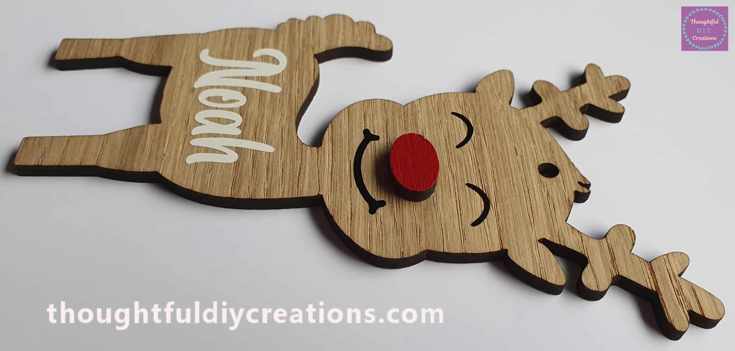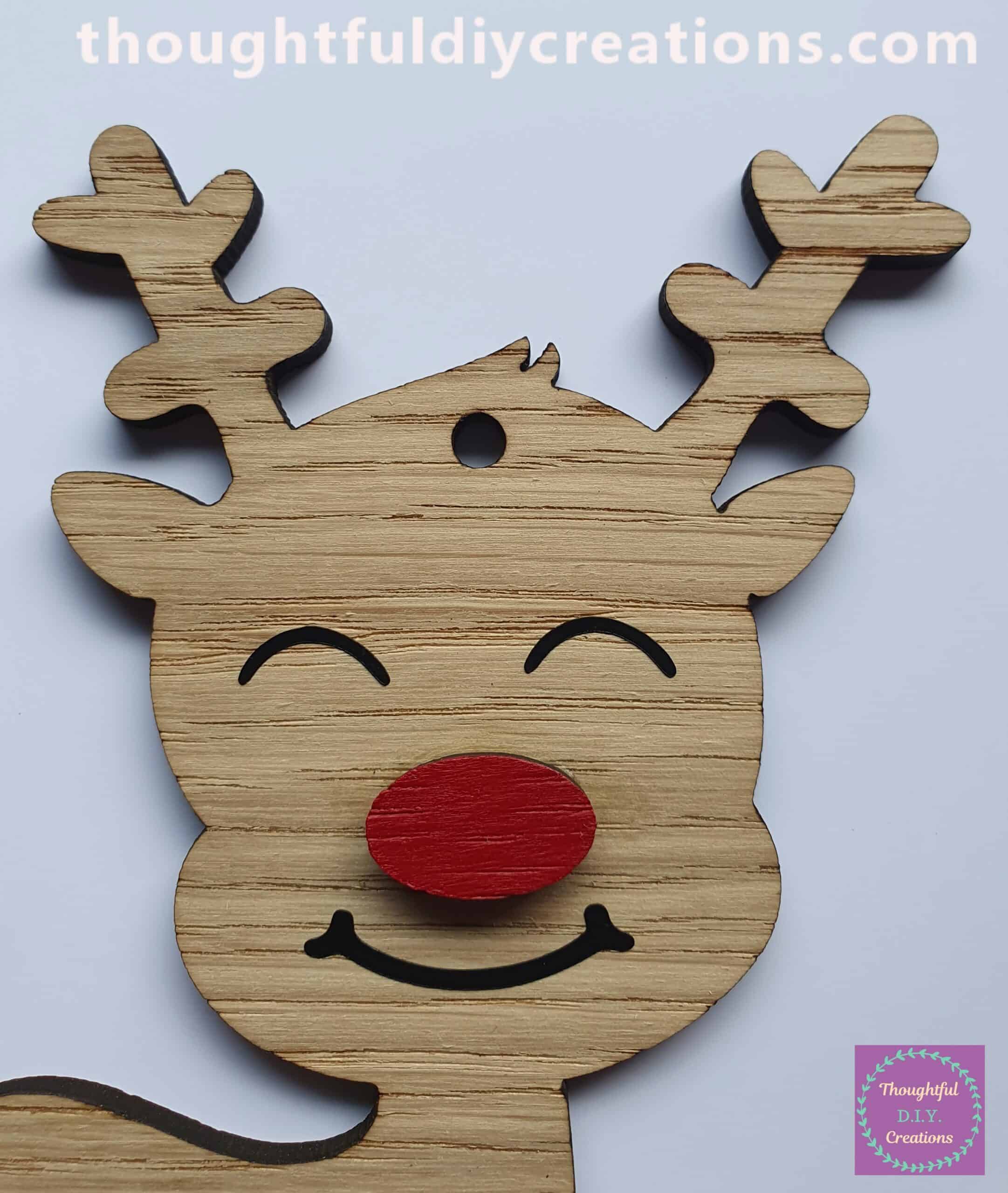 The Reindeer’s Nose can be left Oak to match the Reindeer. It can also be Painted Red for Rudolph or a different Colour to match the Vinyl you choose for the Text.