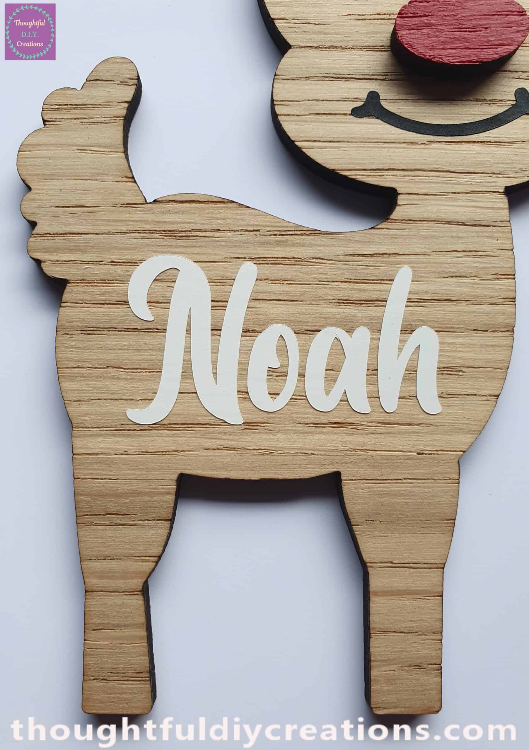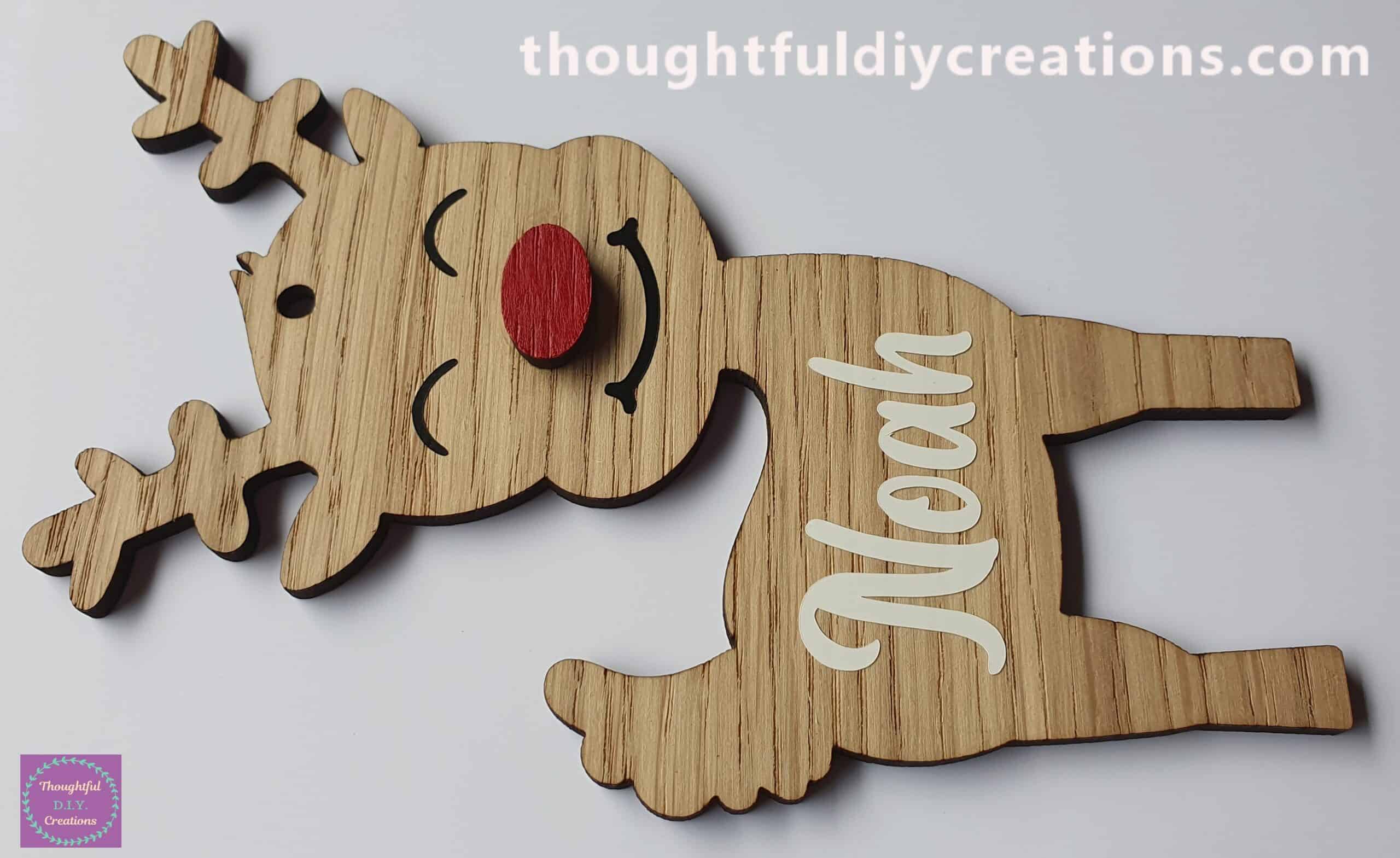 Oak Personalised Reindeer Ornament. It is Laser Cut from Oak Veneer MDF.