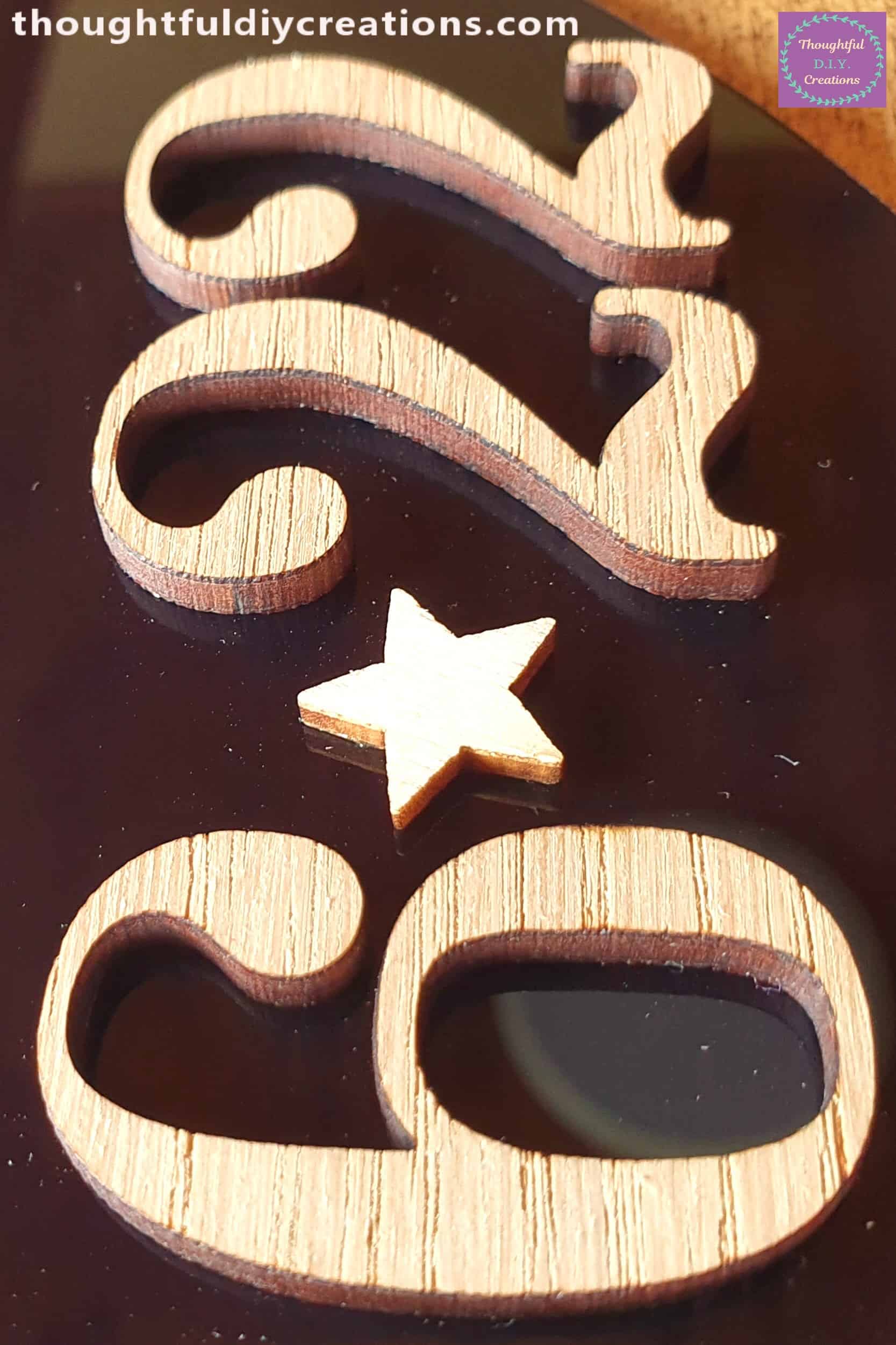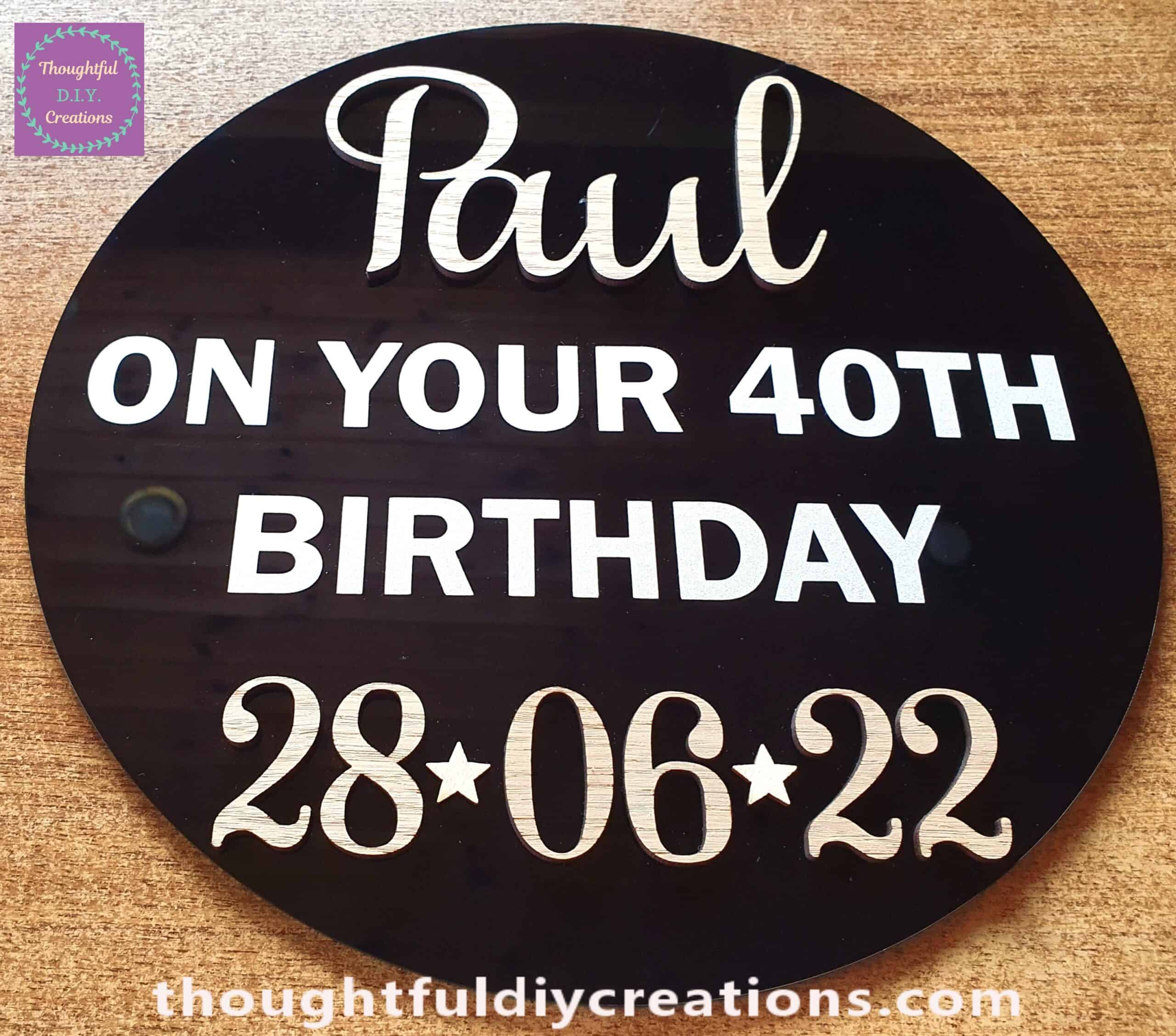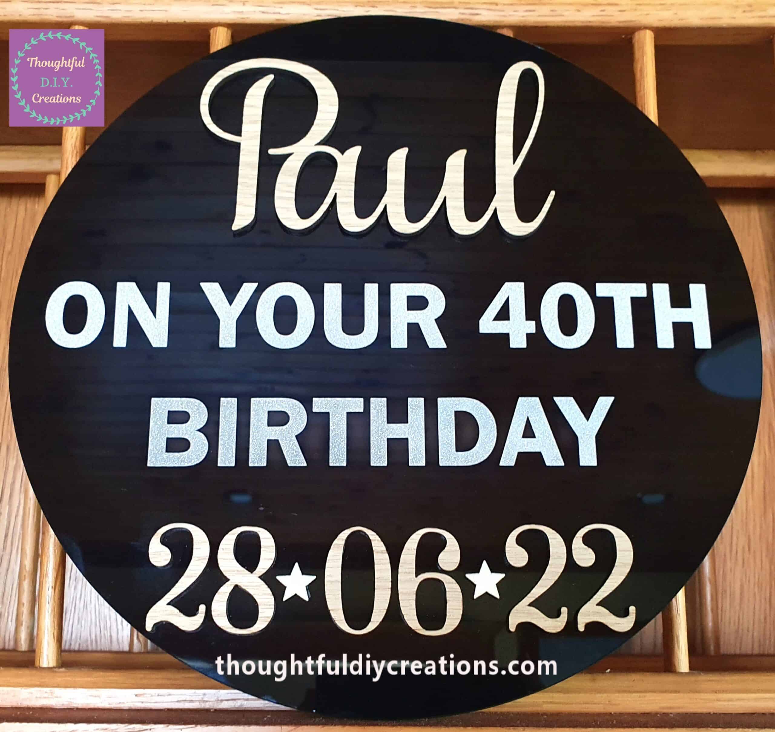 This Acrylic Sign was Created for a 40th Birthday Present. It Includes the Recipient’s Name in 15cm wide Oak Veneer MDF; which measures 3mm in thickness. The Numbers for the Date are 4cm height Oak Veneer MDF also 3mm in thickness. There are 2 small Wooden Stars between the Numbers. The Colour of the Font is Shimmer Silver.