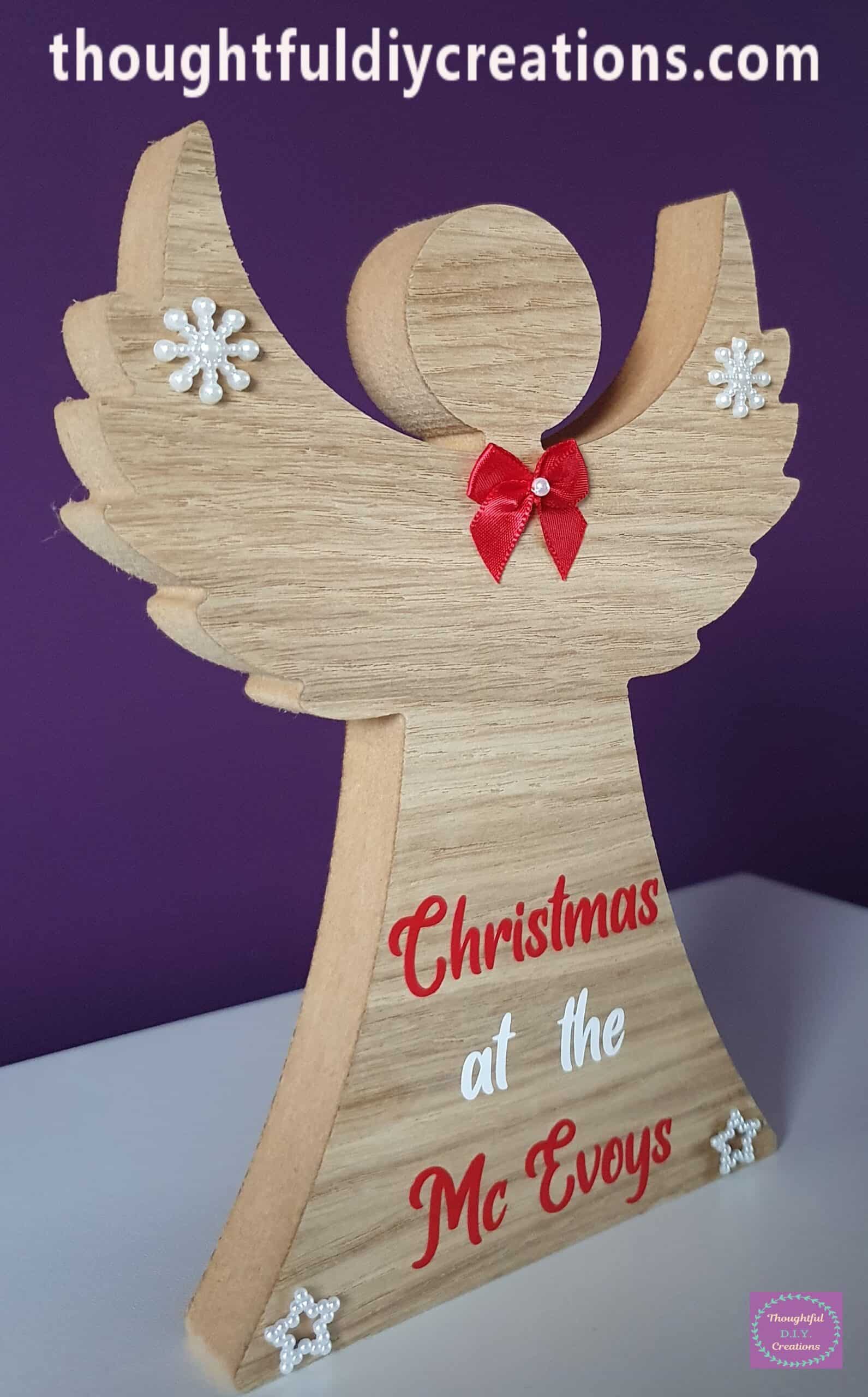 The Completed Angel in the Photo is an Example of a Personalised Family Name Christmas Decoration. It Includes 2 Pearl Snowflakes and 2 Pearl Stars. It also has a gorgeous Red Bow with White Pearl. The Sentiment is made in Matte Red and Matte White Vinyl. It is a meaningful piece to have on display in the Home every Christmas.