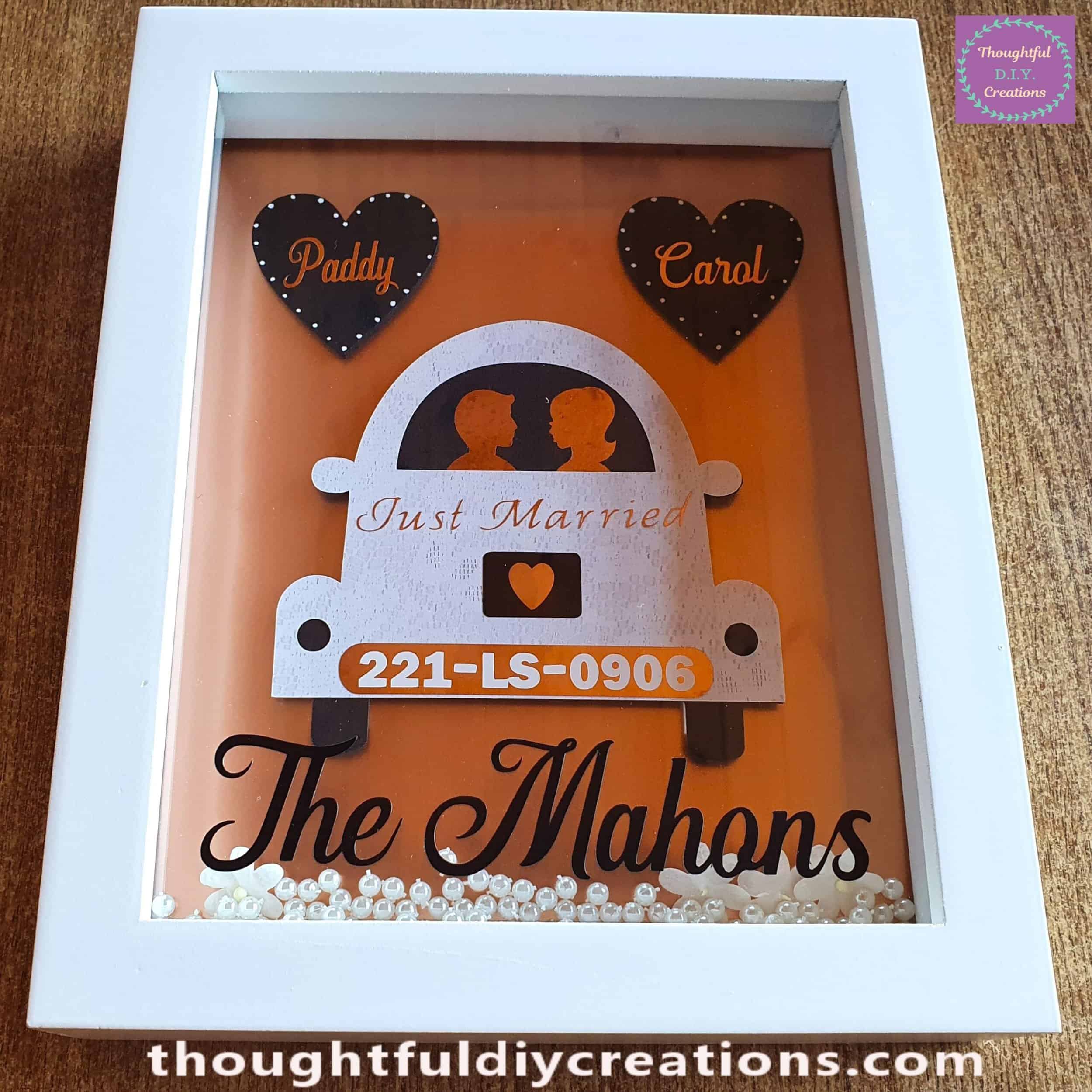This Frame was Created as a Wedding Present. It consists of a Wedding Car with the Date of the Wedding on the Car License Plate and the County the Bride and Groom are from was added for a Personal touch. The Car is made from Lace Paper and has ‘Just Married’ in Rose Gold as well as a Rose Gold heart on the Car. There is a Silhouette of a Bride and Groom in Rose Gold facing each other inside the Car. The Bride and Groom’s Names are displayed in Rose Gold on Wooden Hearts Painted in Black with White Hand Painted Dots all around each Heart at the Top Inside part of the Frame. The Married Couples’ Surname is placed on the Outer Bottom part of the Frame. There are Pearls and Handmade Flowers inside the Shadow Box Frame. The Background of the Frame is Premium Rose Gold Metallic Cardstock. The Wedding Car is attached to the Cardstock inside the Frame with Foam Tape to give a 3-Dimensional appearance.