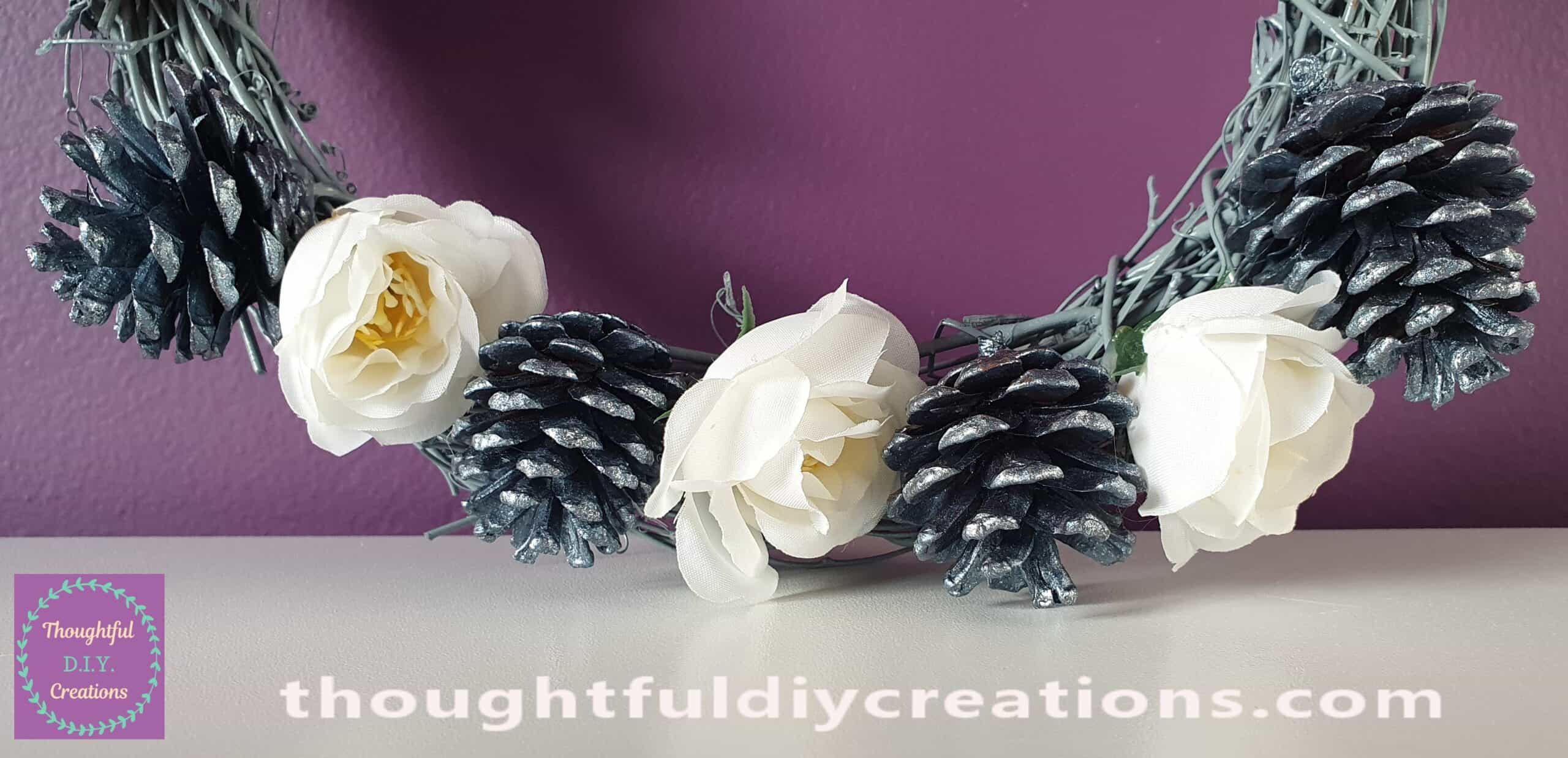 The Pine Cones were Spray Painted all over with 4 Layers of Silver Metallic Spray Paint. I also added 2 Layers of Silver Glitter Spray Paint to the Pine Cones, as well as a layer of Clear Top Coat Spray Paint to Seal the Glitter.