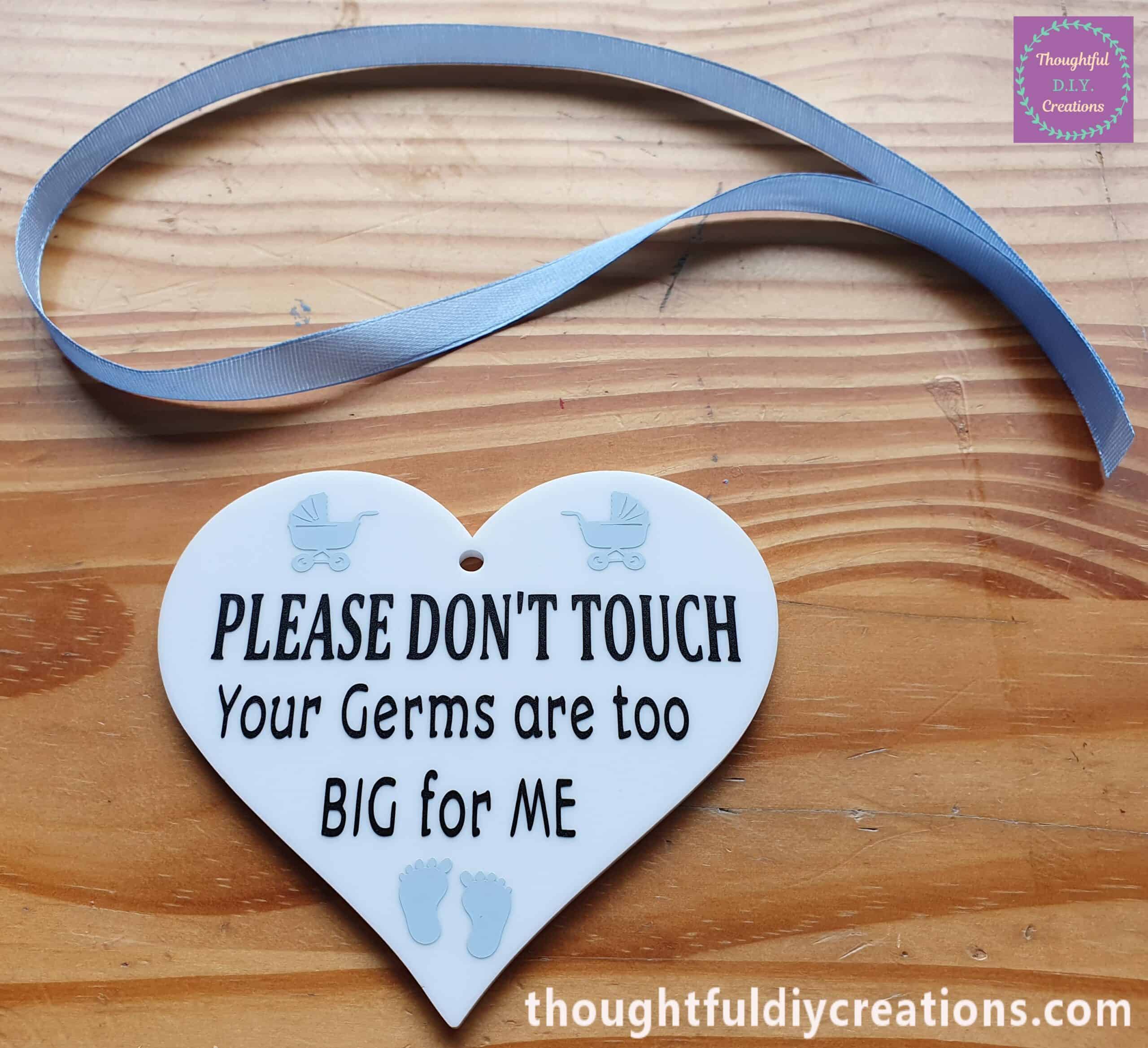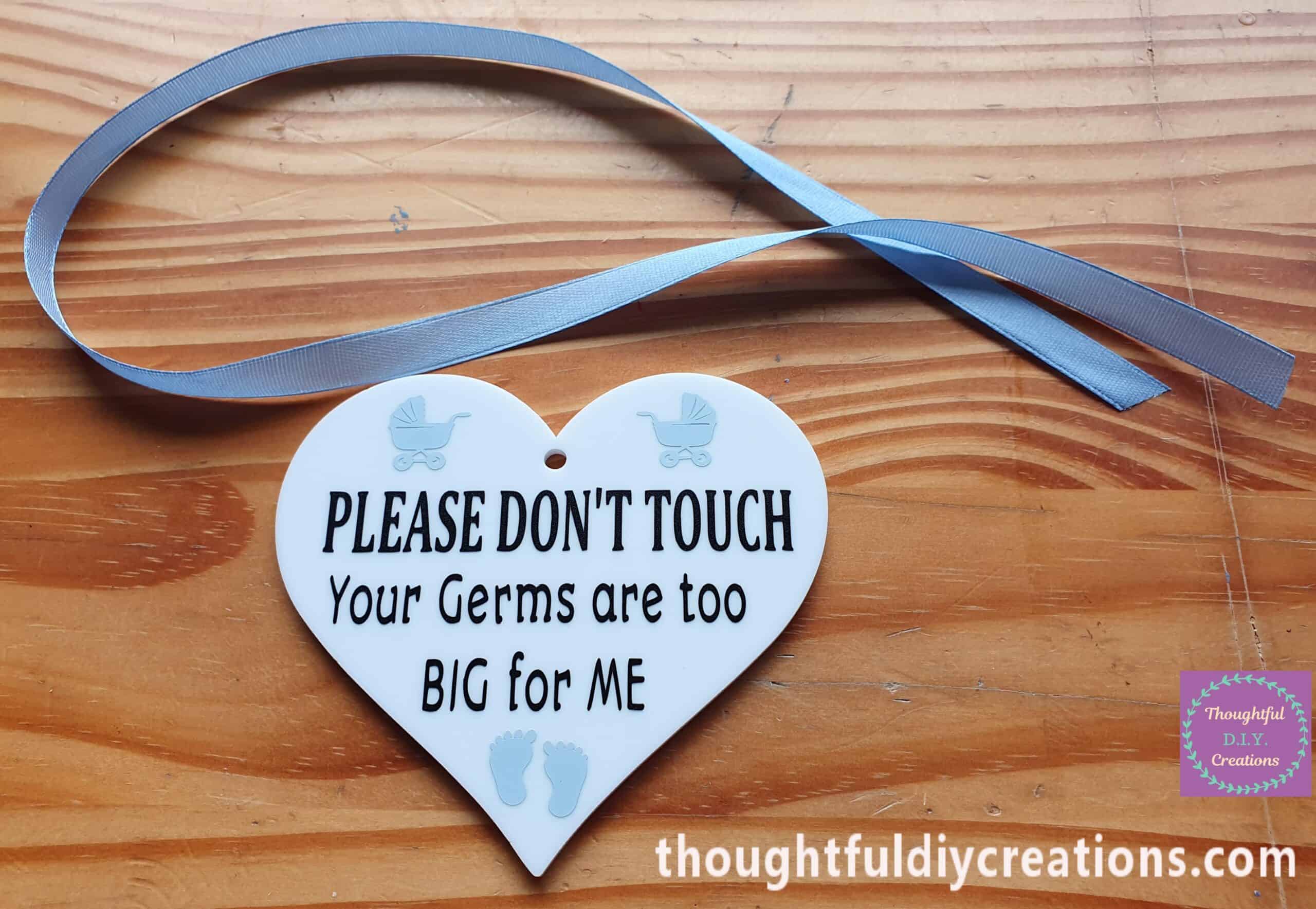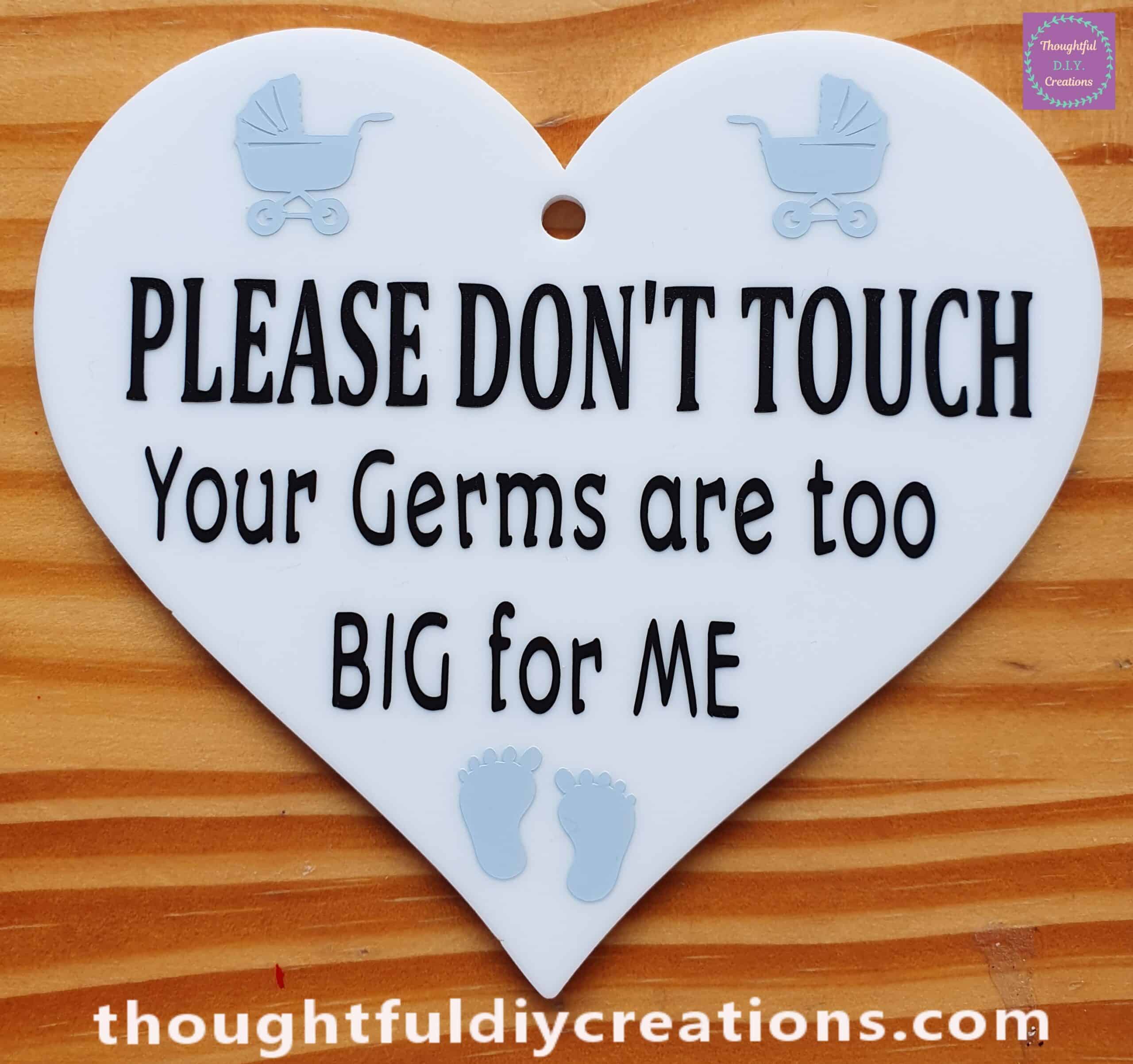 I Designed the ‘Please Don’t Touch’ Baby Heart Sign for Parents to Hang from their Pram, Buggy or Car Seat when Out and About; to prevent Strangers or People you know from Touching, Kissing or Picking up your Baby, and Passing on Germs to your precious new Bundle of Joy.