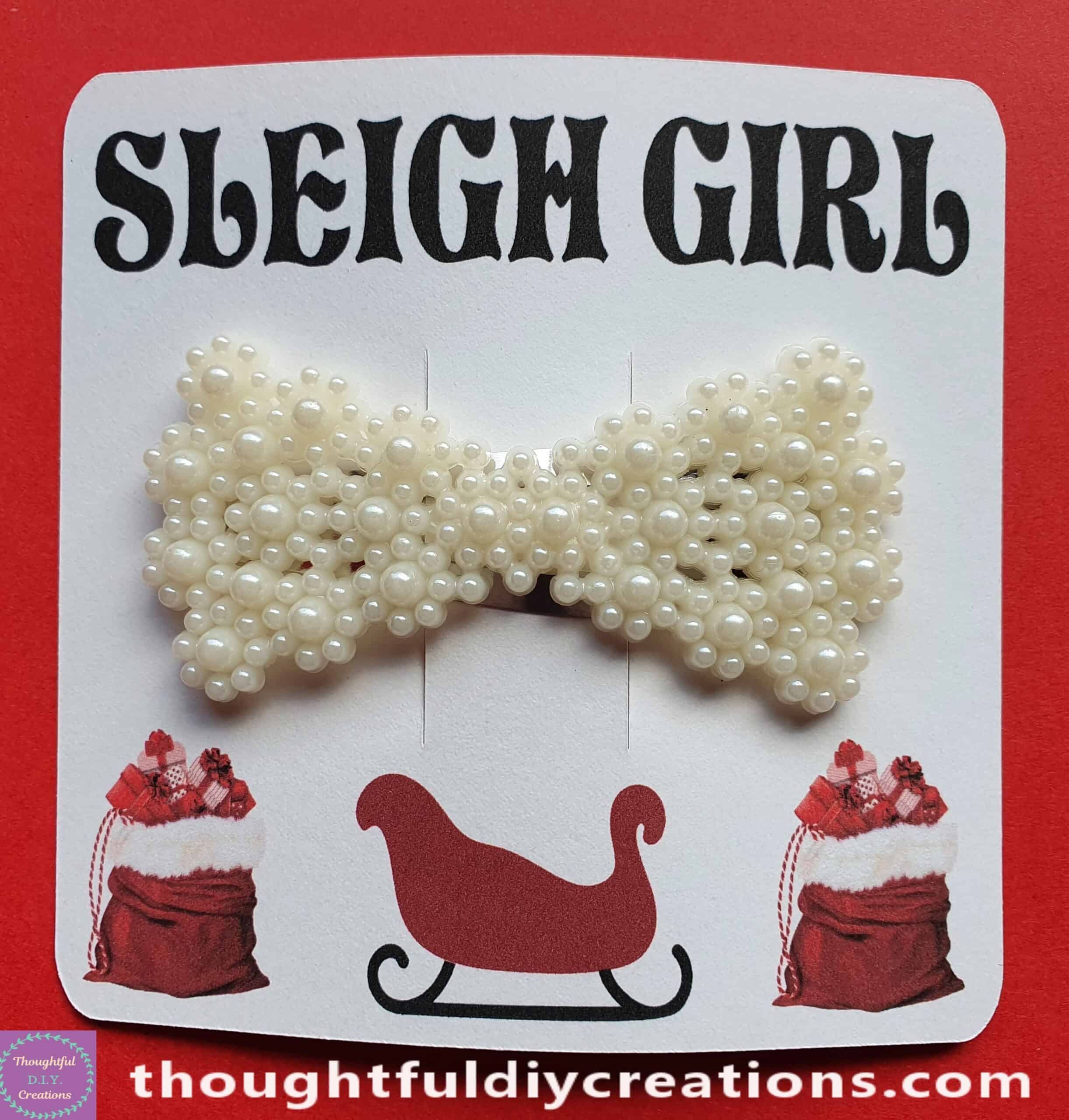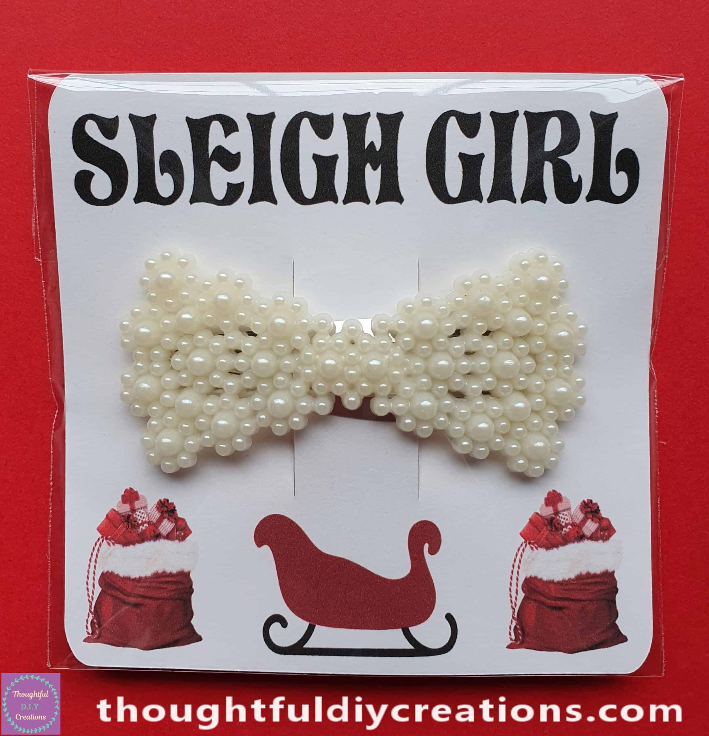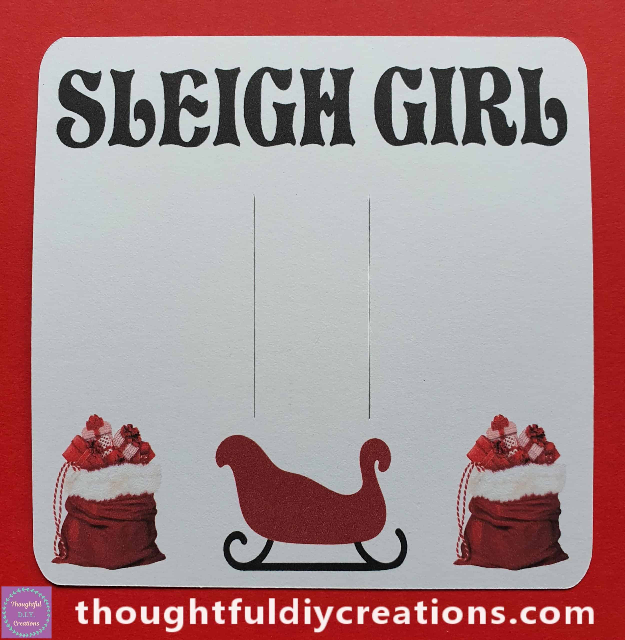 I Designed this SLEIGH GIRL Clip Holder featuring the Text in Black at the Top of the Clip Holder. At the bottom of the Clip Holder are Two Red and White Santa Sacks filled with Presents, and a Red and Black Sleigh in the middle of each Sack.