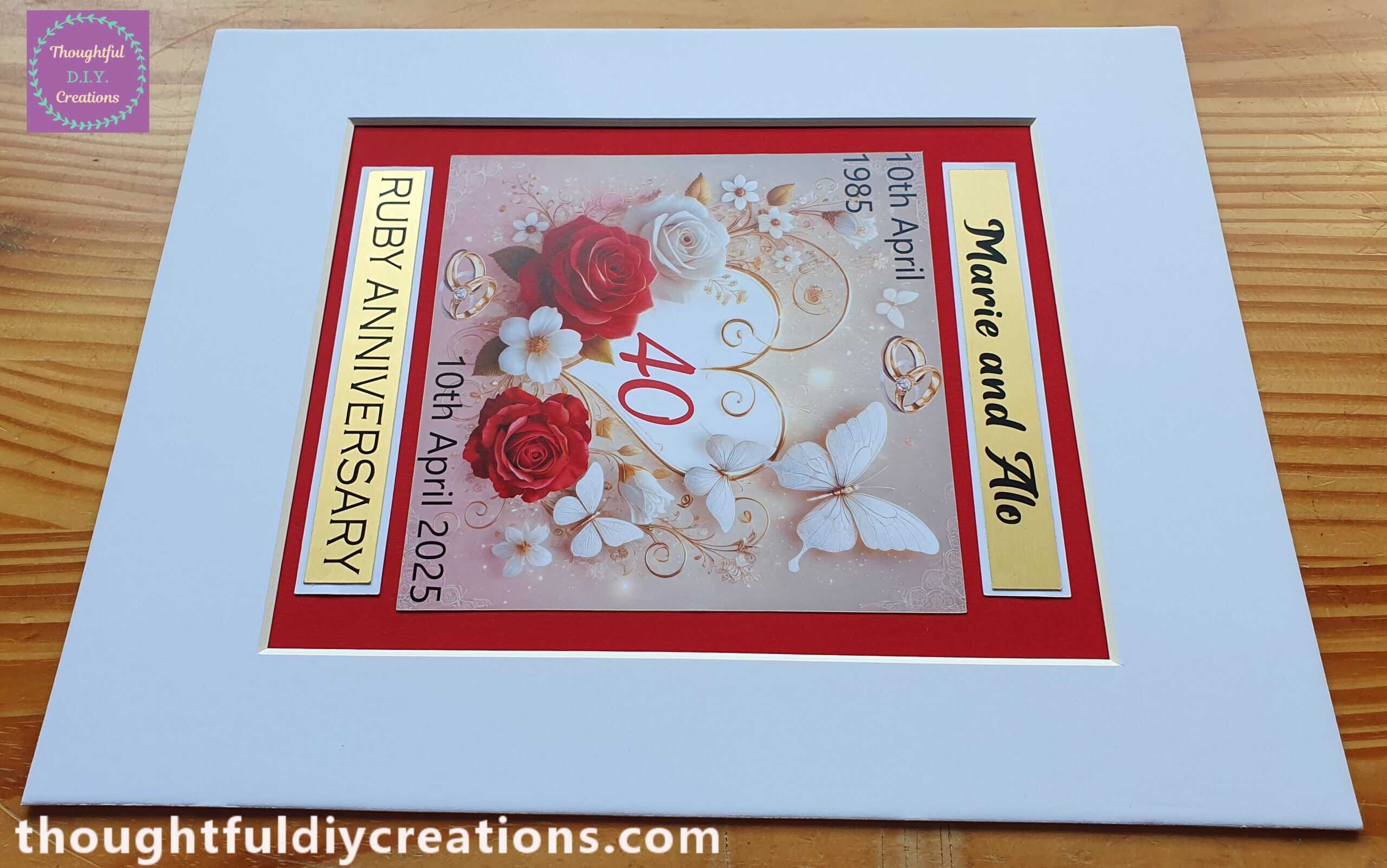 The Custom Print features Red Roses, White Flowers & Butterflies, and a White Heart with Gold Swirls. I added the Date the Couple got Married to the top of the Print, and the Date of their Milestone Anniversary at the bottom of the Print. The number 40 was placed inside the Heart in Red to symbolise the Anniversary, and Wedding Rings were the final touch beside the Date at the top of the Print; as well as on the Bottom of the Print.