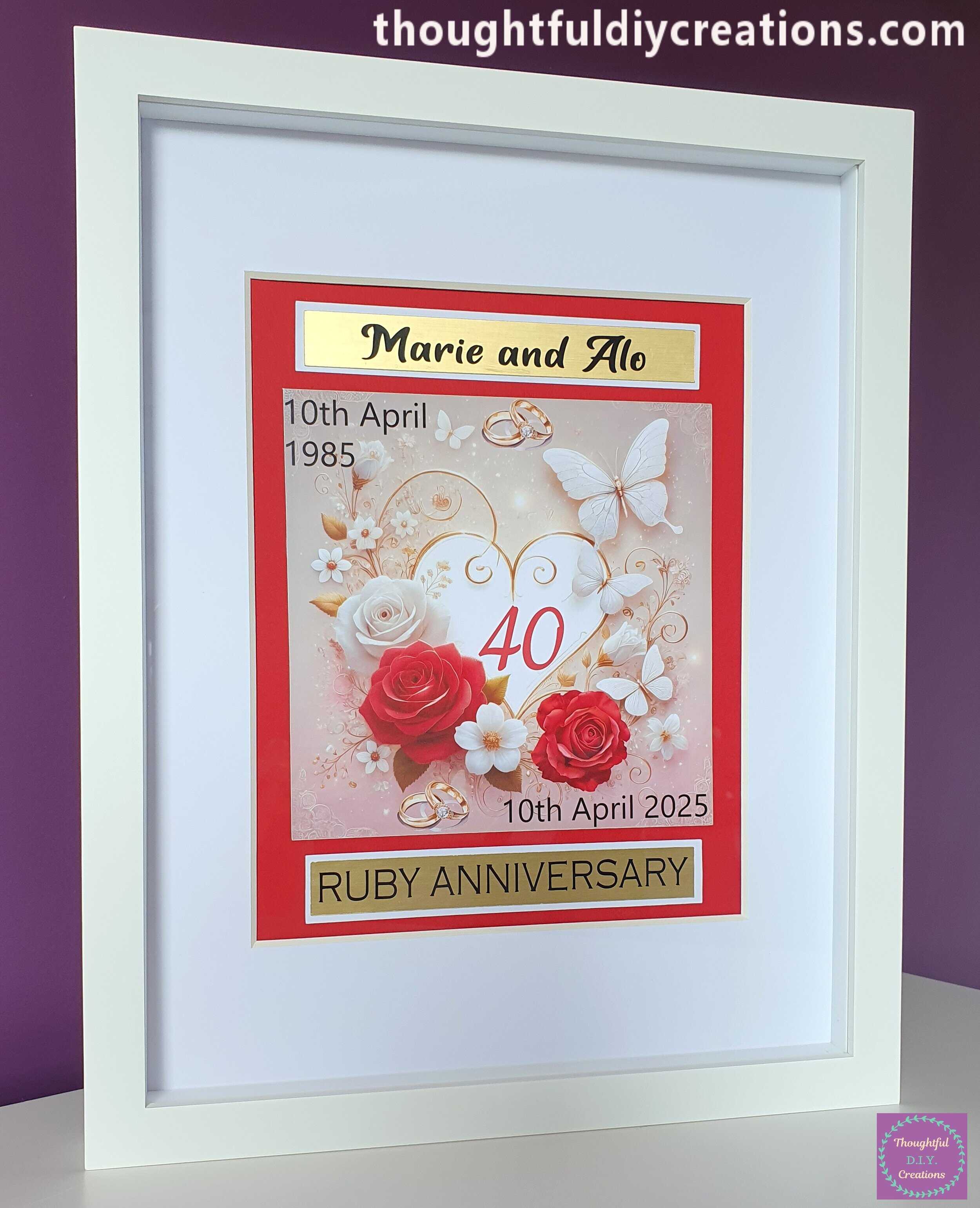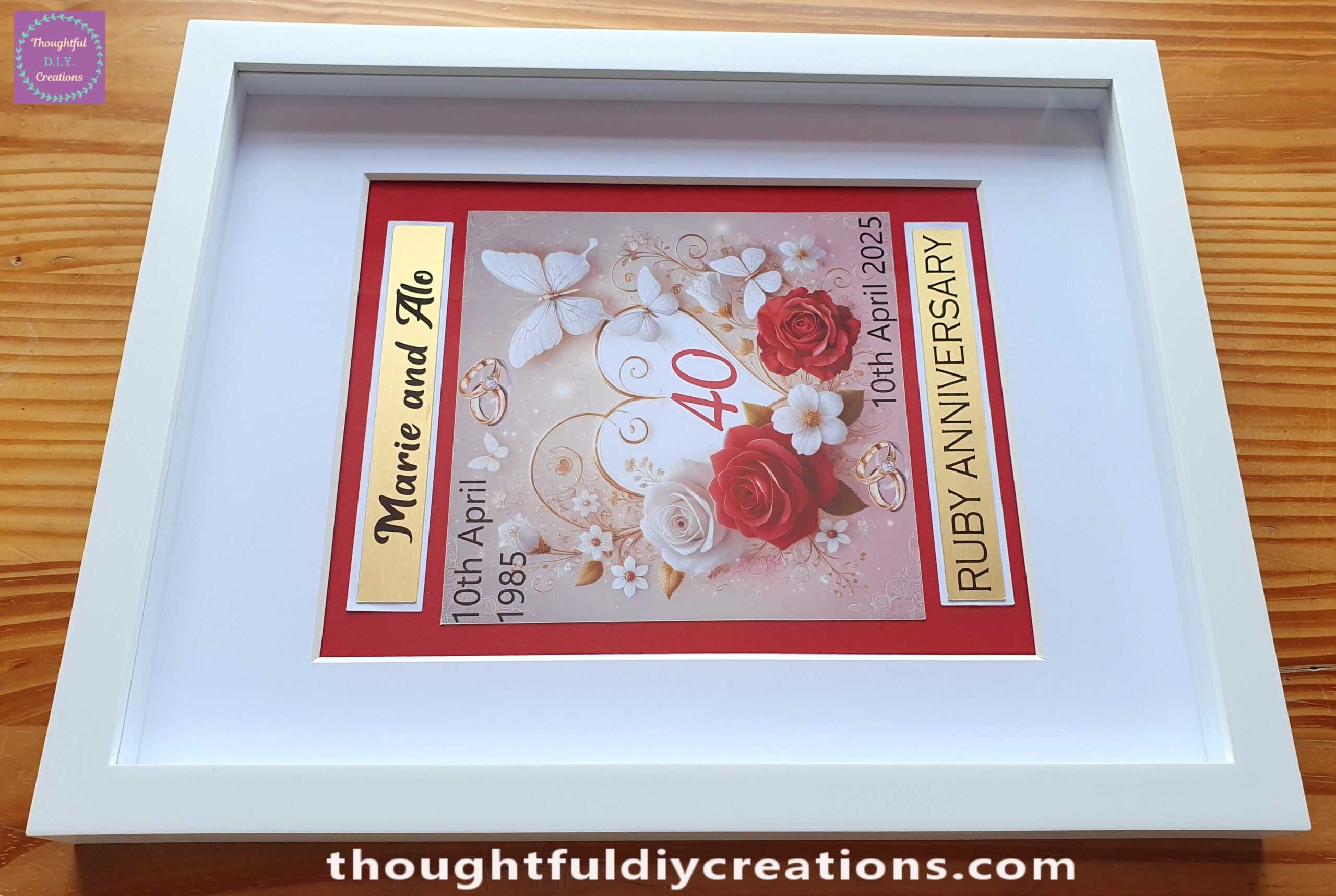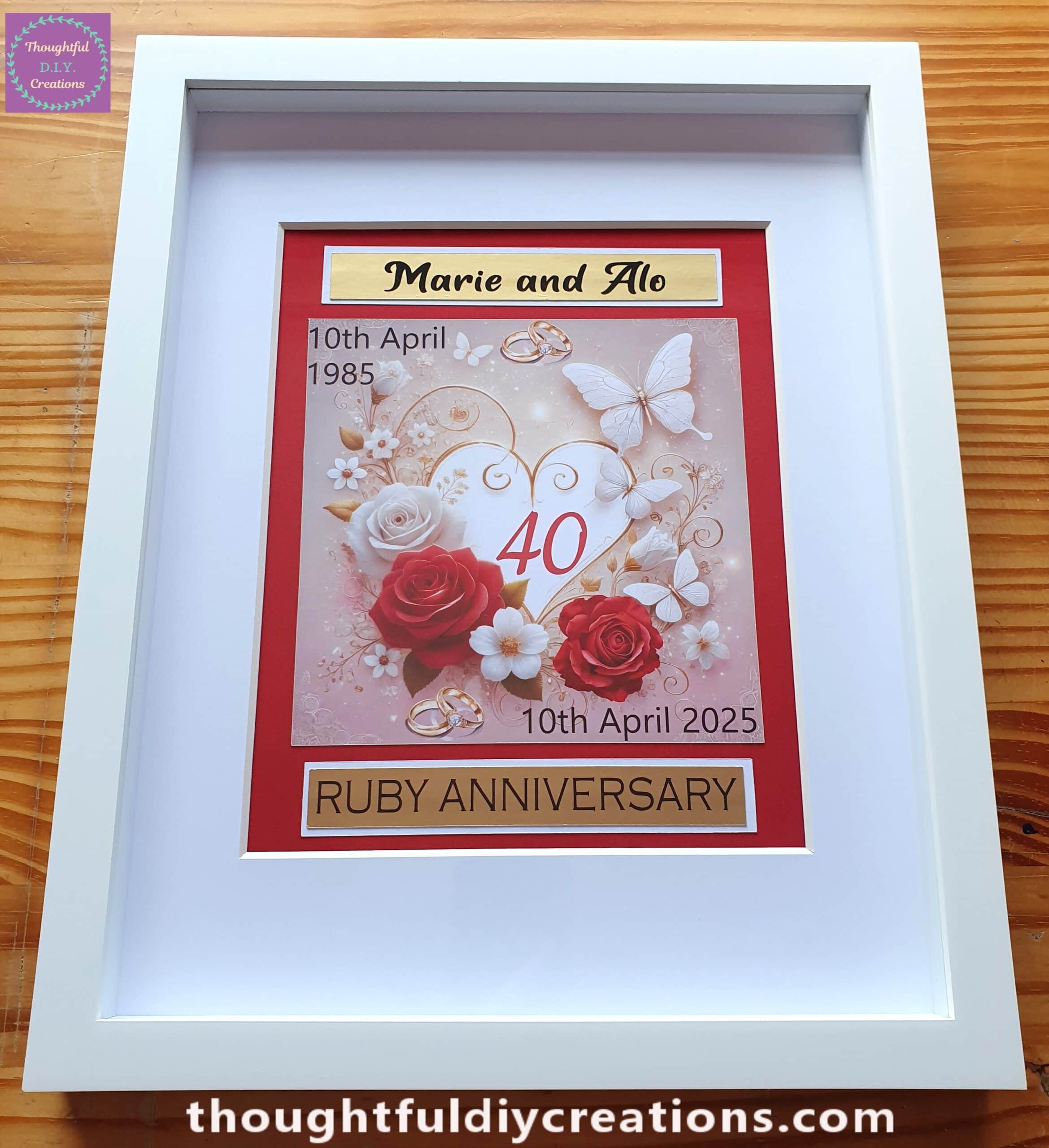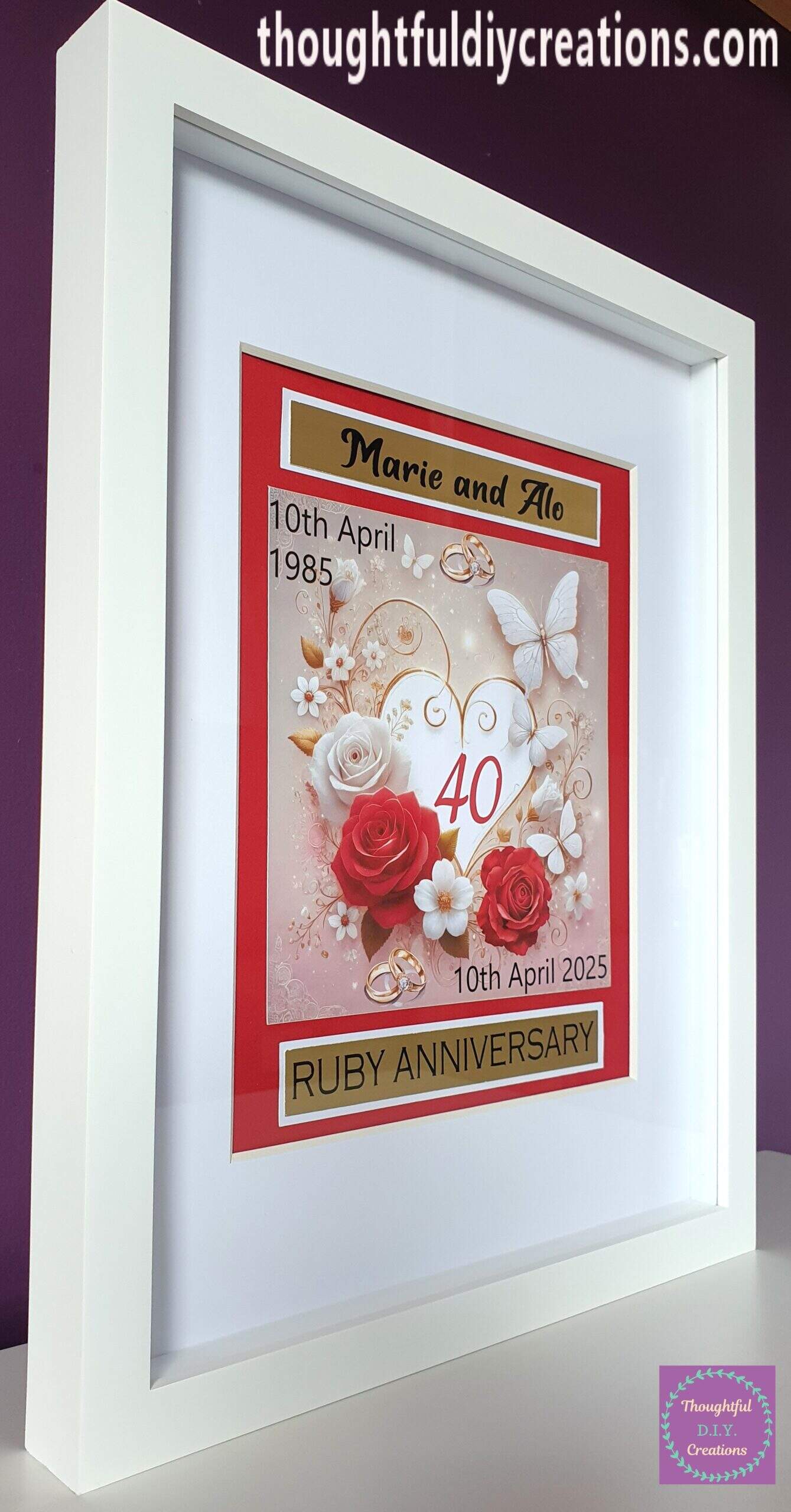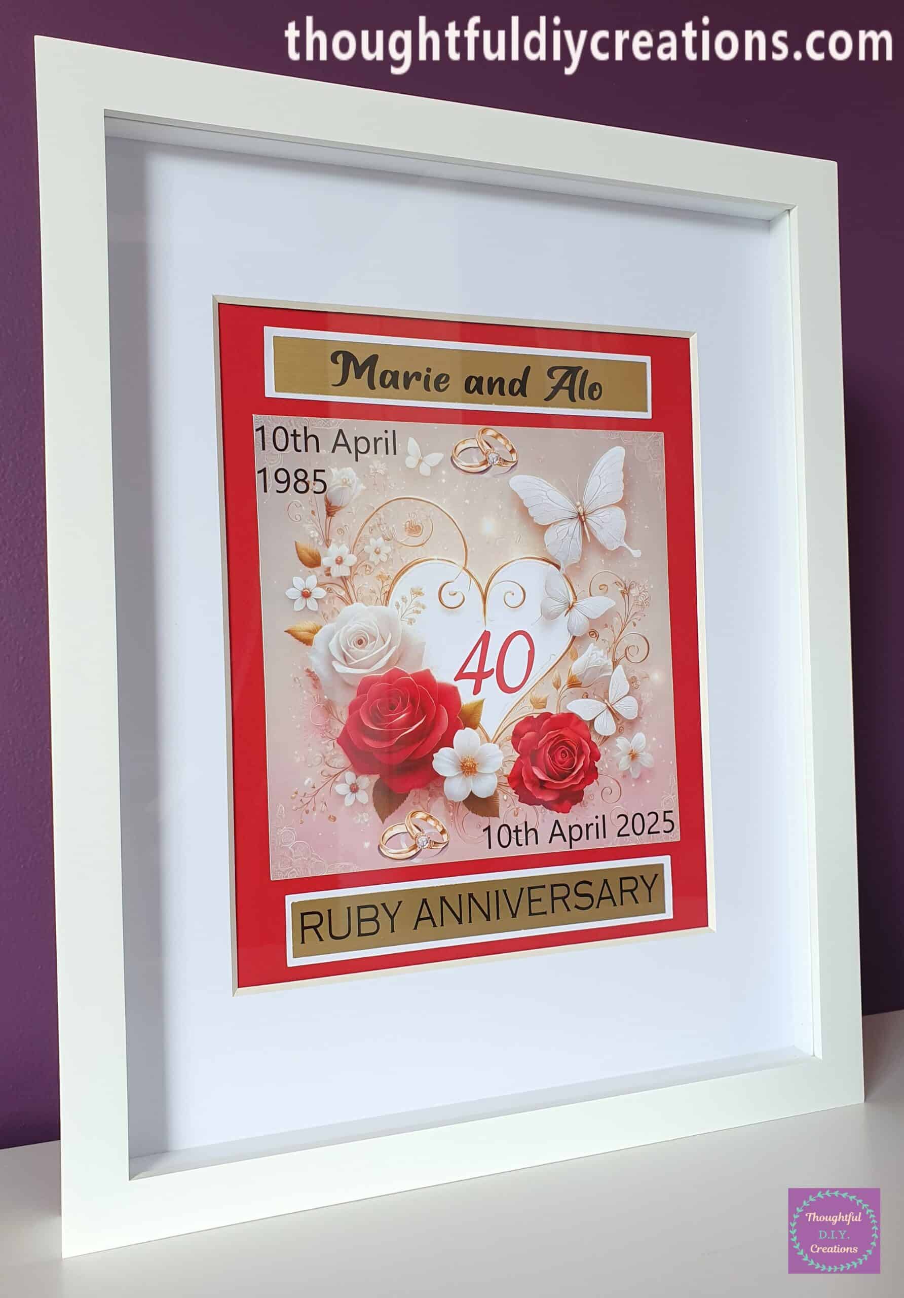 Ruby Anniversary Frame; Custom Frame Print for a 40th Wedding Anniversary; Presented in a White Shadow Box Frame.