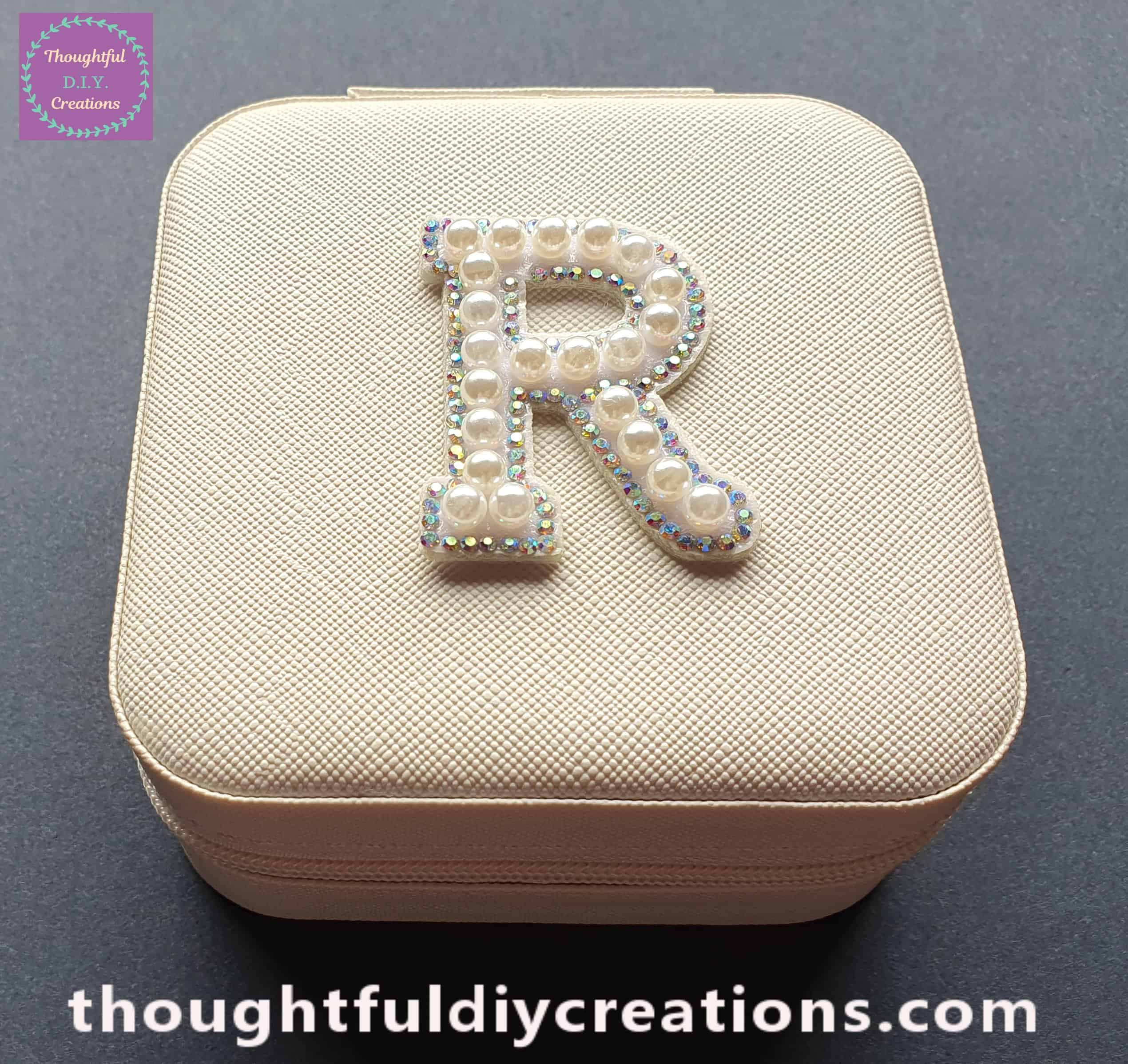 The Jewellery Box can be Personalised with a Name or your Initials on the outer flat Surface with Vinyl, OR have a beautiful Pearl and Diamond encrusted Letter with the Initial of your First Name.