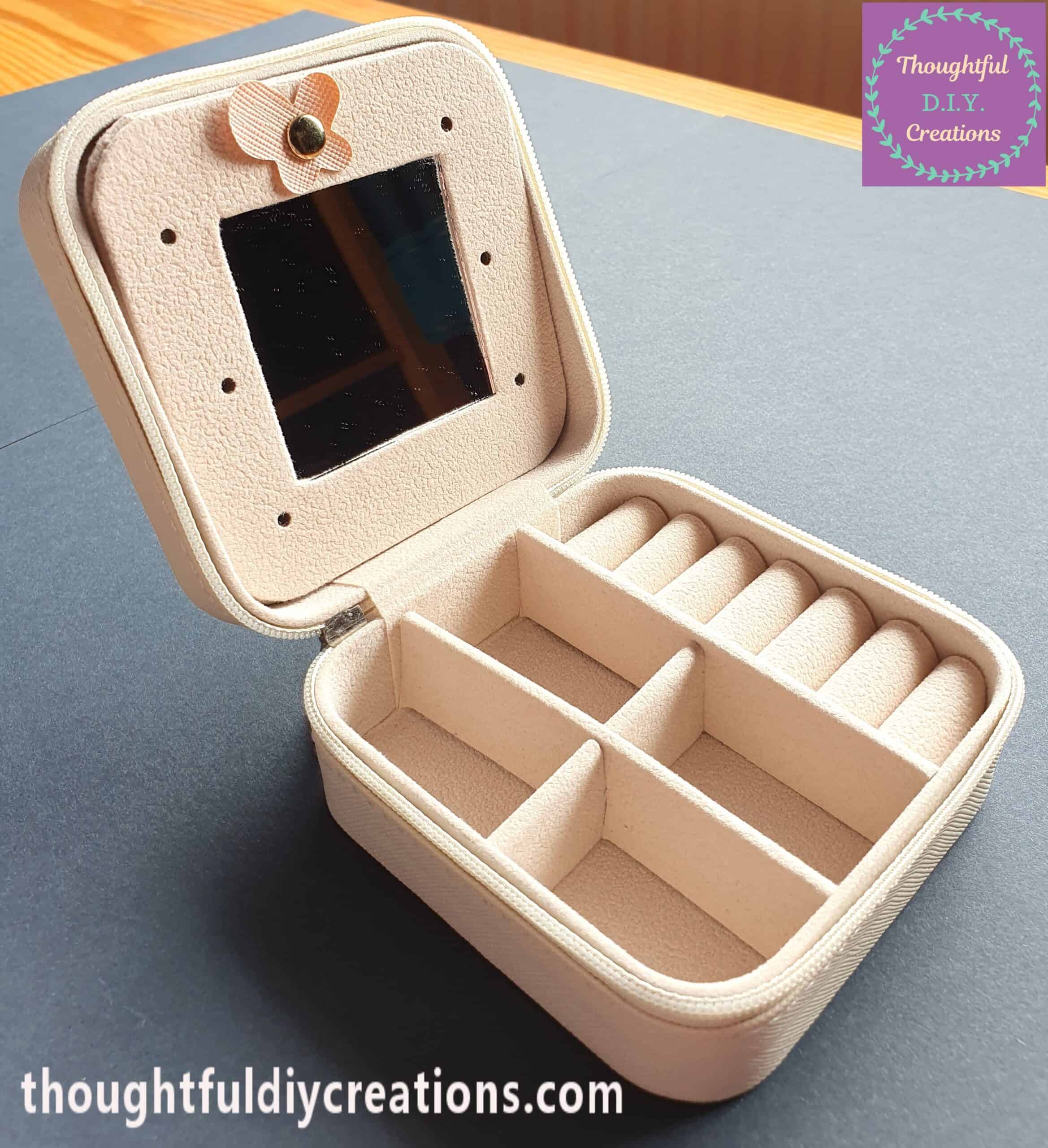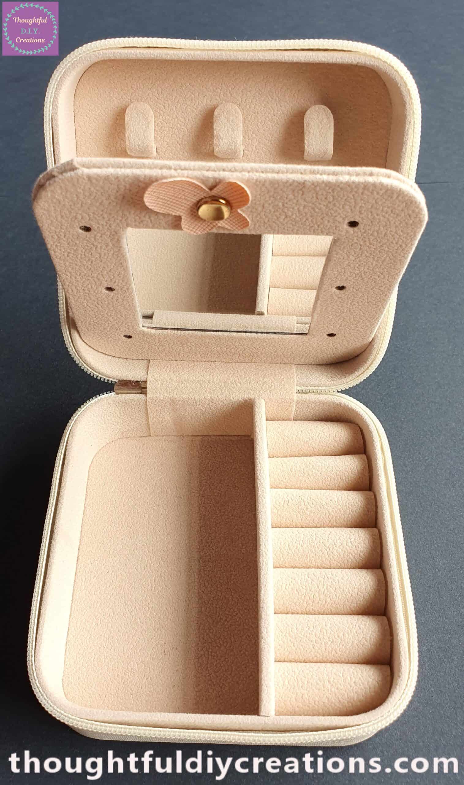 Small Personalised Jewellery Box in Cream, with Mirror & Cleaning Cloths.
