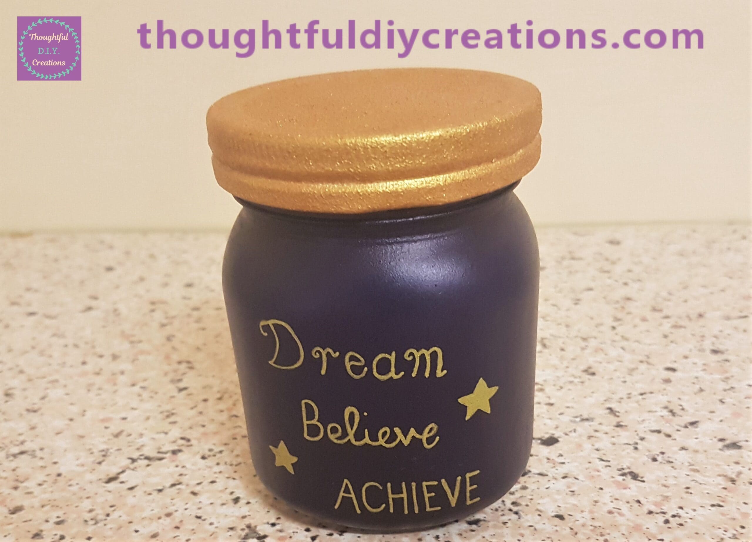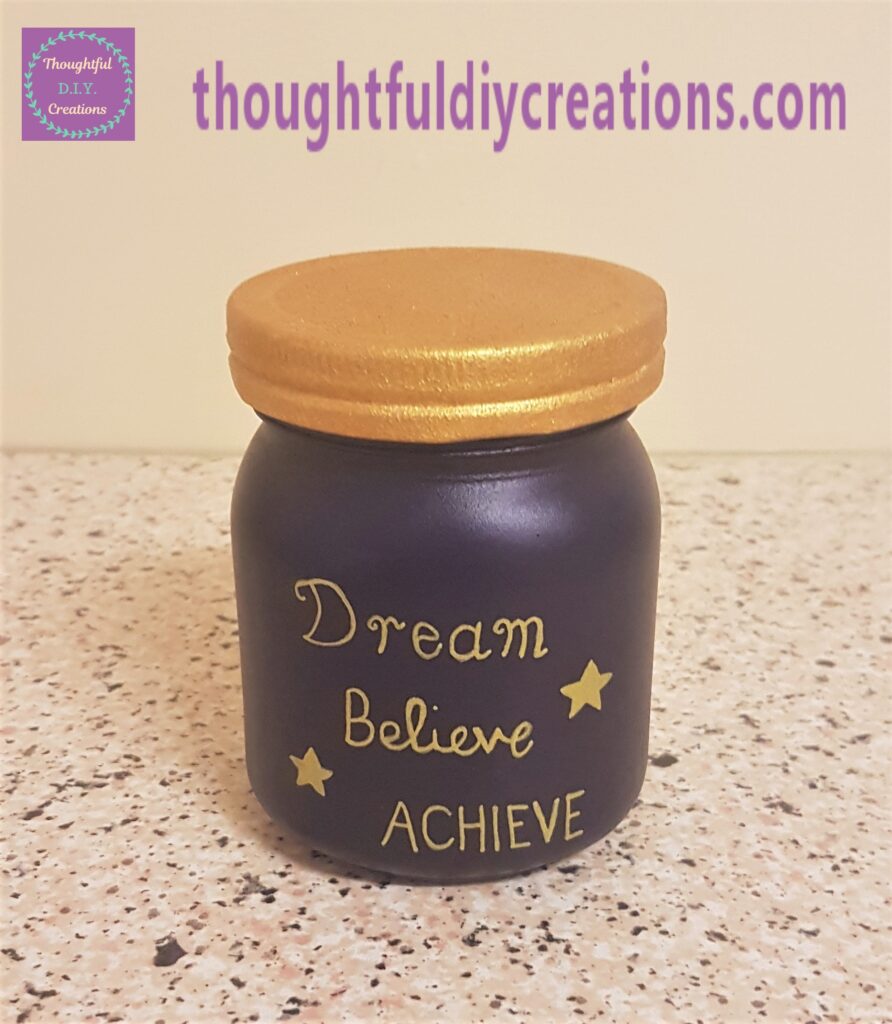 I got my ‘Gold uni POSCA Acrylic Paint Pen’ with 0.7mm nib. I wrote the word ‘Dream’ with a slight curve on the edges of the Font, on the top of the Jar using the Paint Pen. I wrote the word ‘Believe’ under the word Dream and joined my letters together this time. Finally I wrote the word ‘Achieve’ using Block Capitals under the word Believe, on the bottom of the Jar.