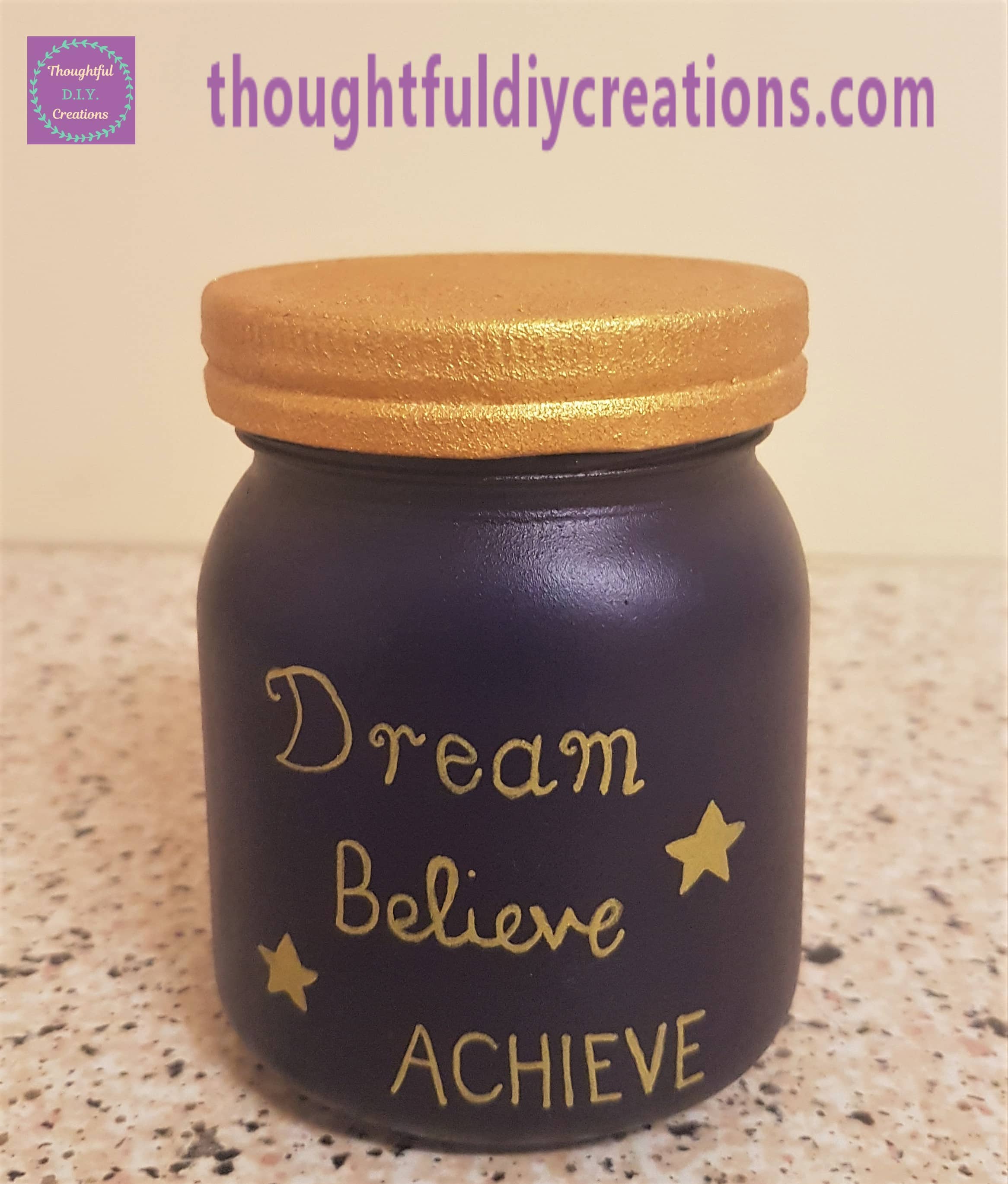 I am delighted with my Re-Purposed Jar with Up-Lifting Quote. I love the combination of the blue/navy with the Gold. I really like the size of the Jar as it’s not too big or small. It can be displayed on a Bedside Locker, Shelf, or on a Table without taking up too much space.